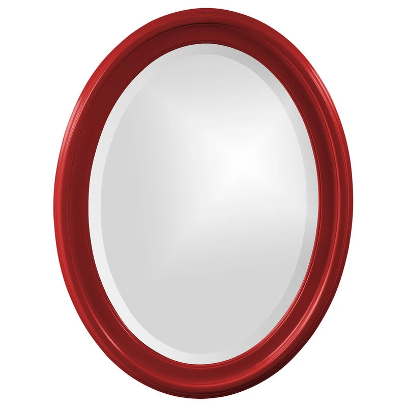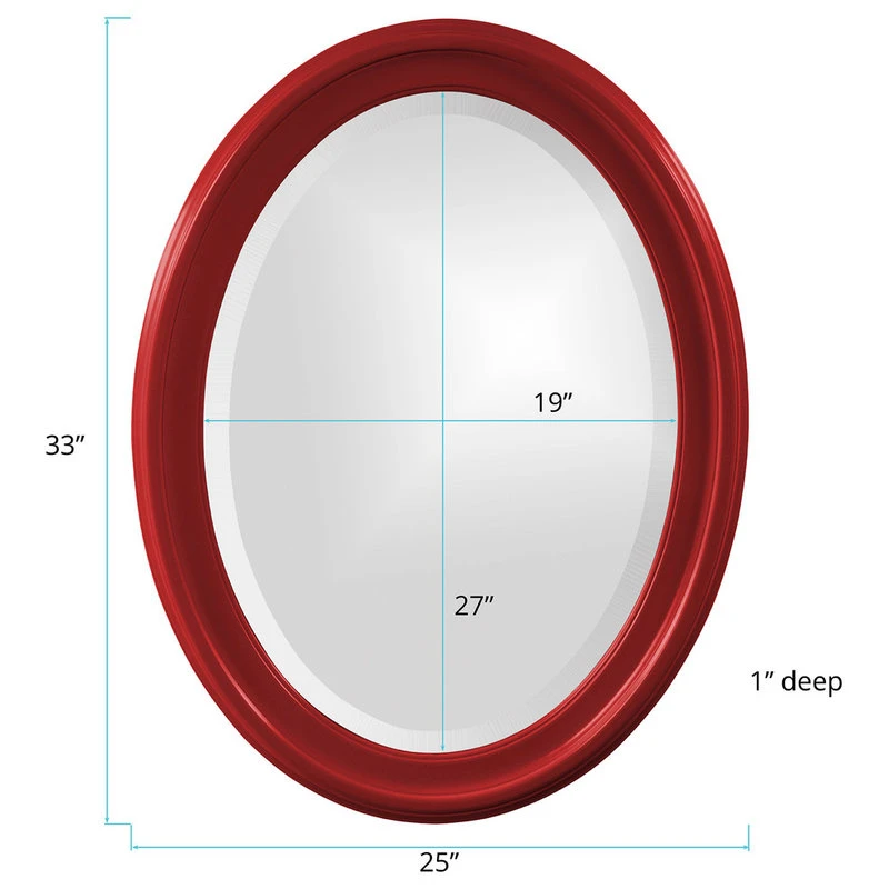 The George Mirror features a glossy red lacquer finish. The oval frame is made from wood and is accented with grooves for added depth and character. For more added detail the mirror features a one inch bevel. Its Transitional style makes this mirror a favorite for bringing some flair to your decor. This simple yet stunning piece would be a great addition to any room. It is a perfect focal point for an entryway, bathroom, bedroom or any room in your home. D-rings are affixed to the back of the mirror so it is ready to hang right out of the box in either a horizontal or vertical orientation! The George Mirror is part of our custom paint program and is available in one of ten vivid colors. It is proudly painted in the USA.