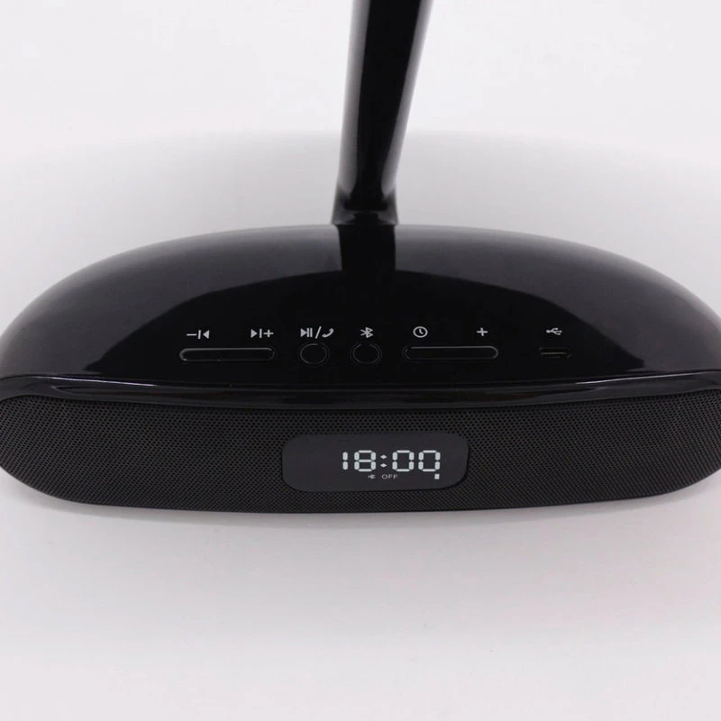The Melody has a built-in digital display with a clock. The display also shows if your Bluetooth is on/off and the charge of your Melody out of 3 bars. When charging, the display shows “USB” and the battery bars will be flashing. When your Melody is low on battery, a single bar will be flashing.
