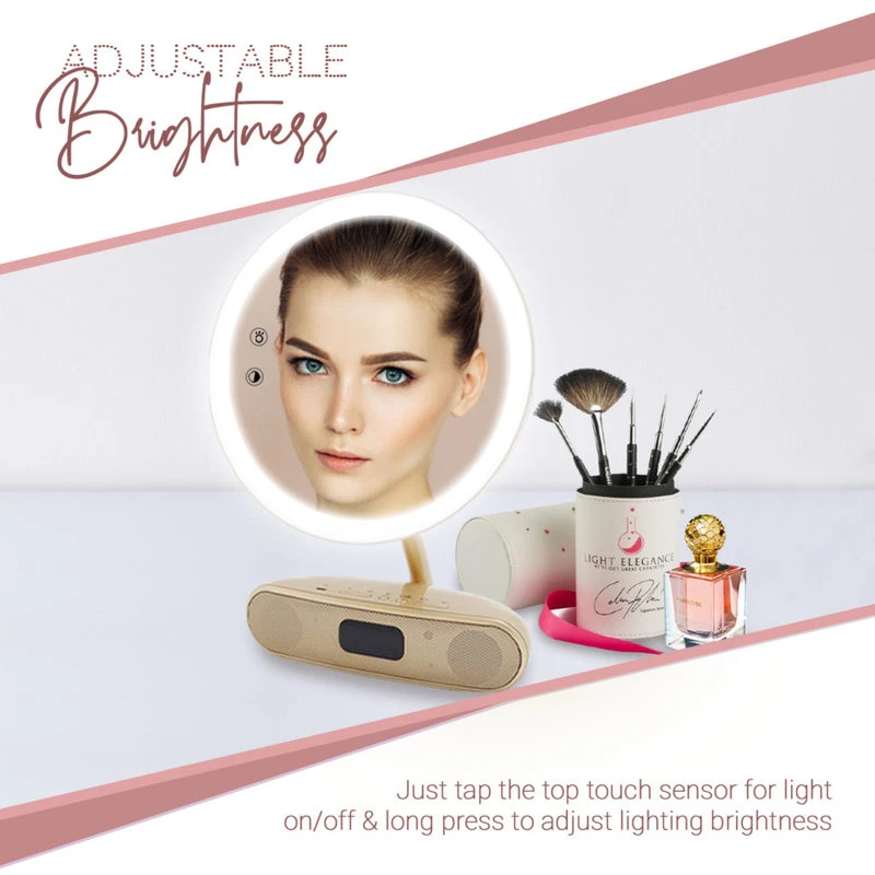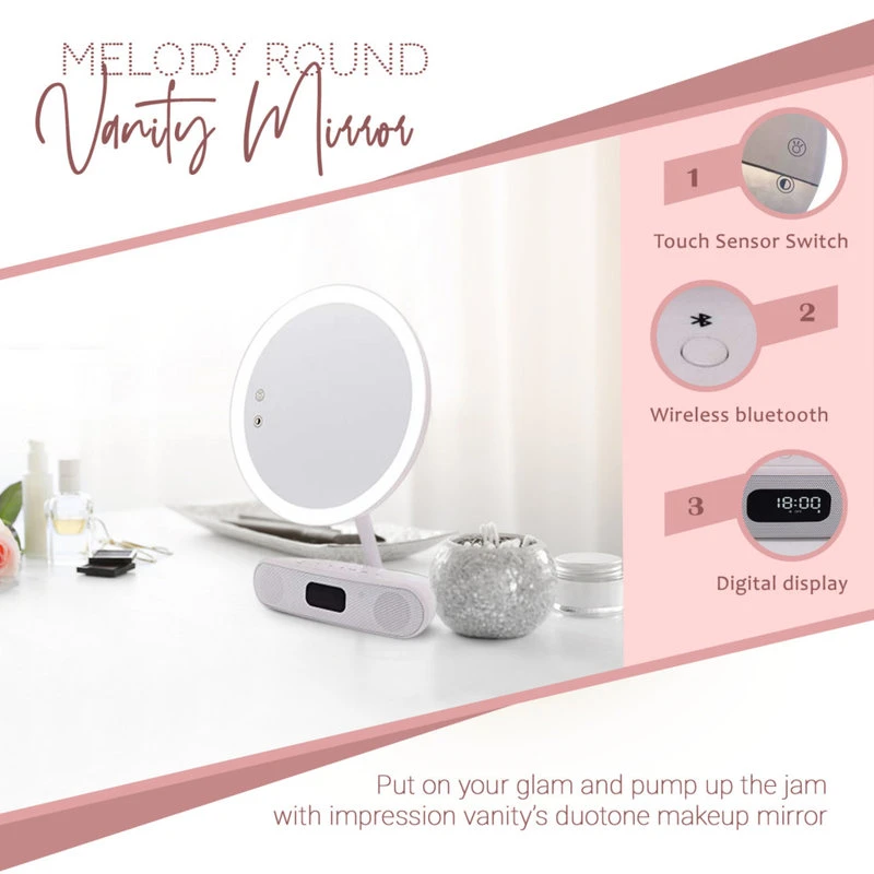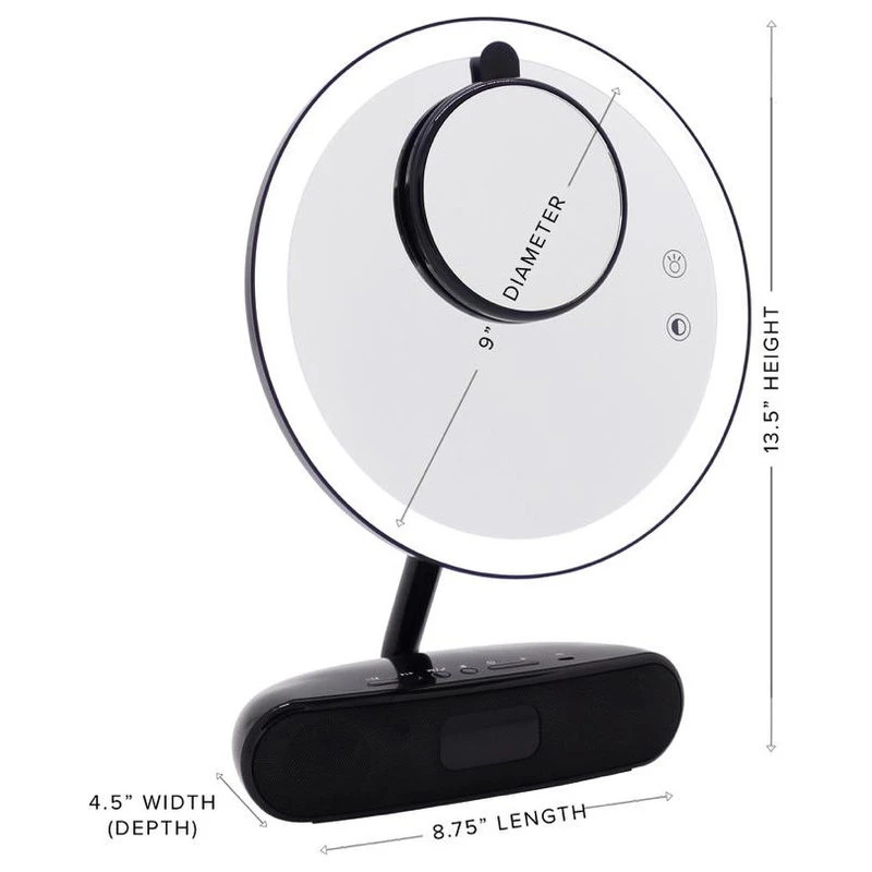 Put on your glam and pump up the jam with Impression Vanity’s Melody 9-inch Duotone Makeup Mirror! This smart makeup mirror features Bluetooth to connect with your devices and play your music with its loud dual speakers. Control the volume, change songs, and take calls all from your mirror. It is also easily rechargeable with a micro-USB.