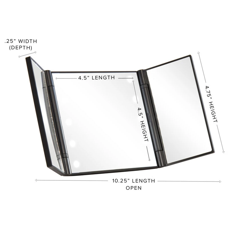 - Illuminated center mirror with 8 bright white LEDs for fool-proof touch-ups