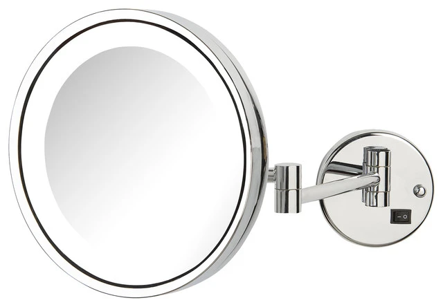 The Jerdon HL1016CLD 9.5-inch 5X Magnified LED Wall Mount Direct Wire Mirror is used in luxury hotels and spas because of its convenience, sleek look and precise magnification. With a mirror diameter of 9.5-inches and 5X magnification, you can be sure that every detail of your hair and makeup are beautiful and flawless. The LED light is designed around the perimeter of the mirror to distribute light evenly. The HL1016CLD extends 16-inches from the wall and allows for movement at different angles. The on/off switch on the base will activate the LED lighting when you need it. This mirror has an attractive chrome finish that protects against moisture and condensation. The HL1016CLD is designed to be a direct wire mirror and connects to an existing junction box on the wall. There is no power cord and plug. This beauty accessory comes complete with mounting hardware for an easy installation.