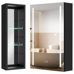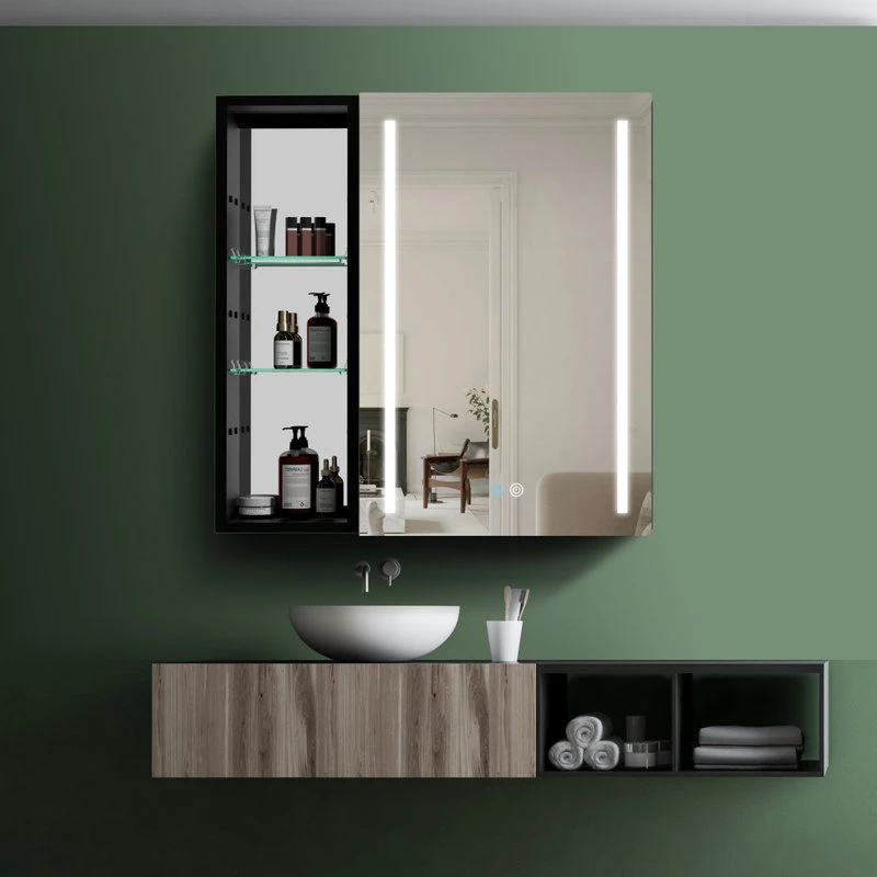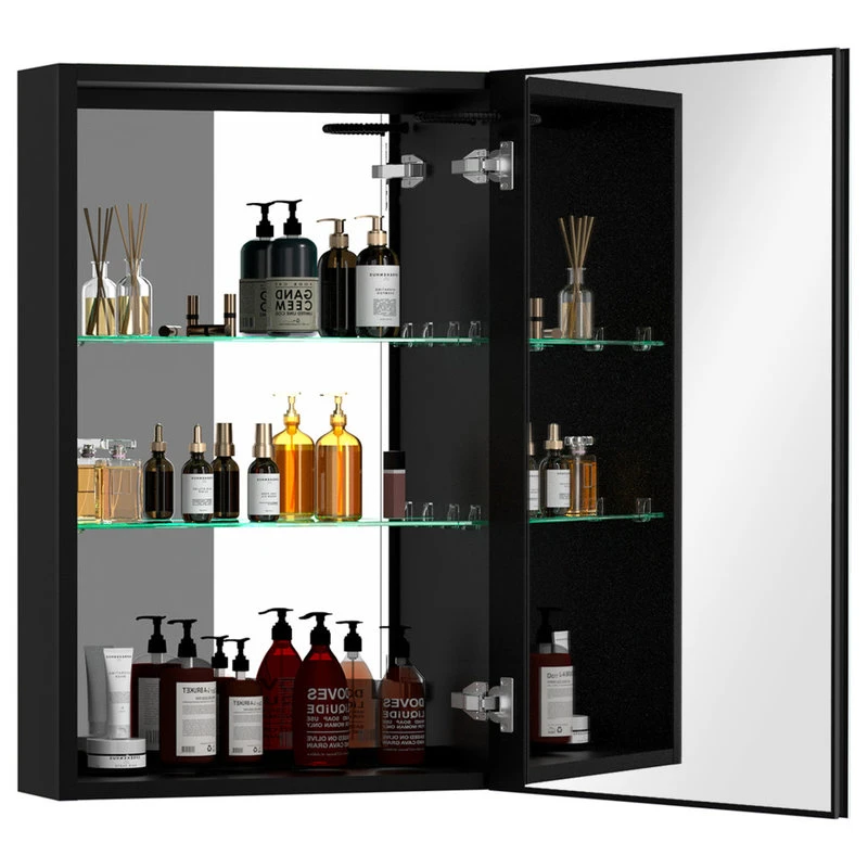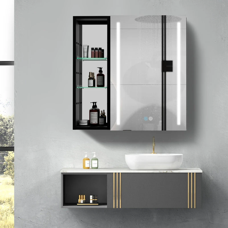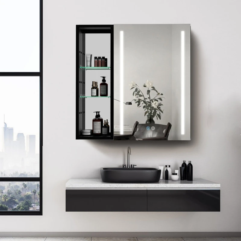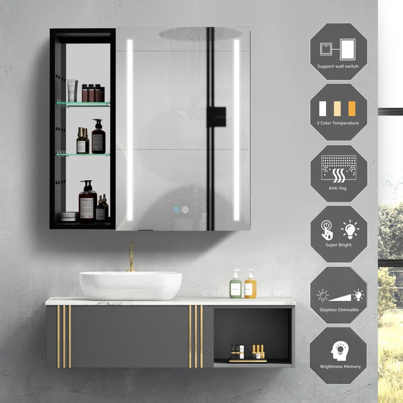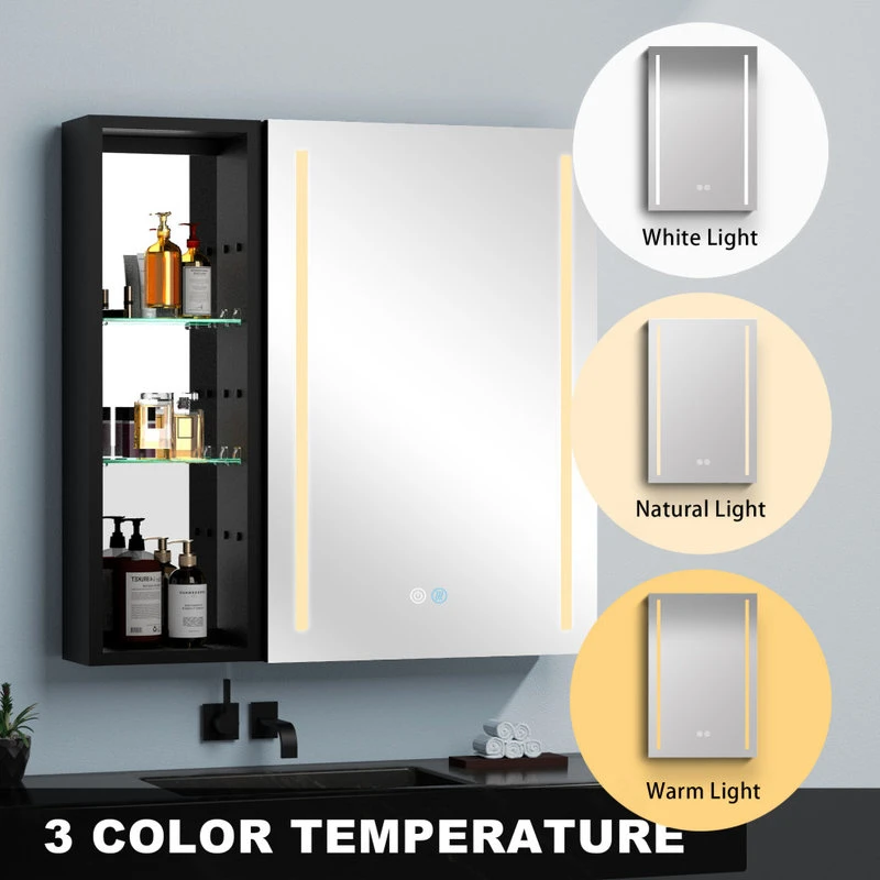 With a sleek mirrored surface inside and outside, this 30-inch multifunction medicine cabinet is a must-have for any bathroom type. This cabinet has plenty of storage space with built-in glass shelves and open shelves to hold your skincare and bathroom supplies. The dimming function allows you to better control the lighting and room atmosphere, making daily grooming more enjoyable than ever. The rust-free aluminum bathroom vanity mirror with lights is durable and moisture-proof and is the best choice for your bathroom.[Quality Materials] The mirror frame is made from aluminum alloy material, which is corrosion-resistant. You don’t have to worry about the stability of the structure.[LED Lights] 3-color temperature, dimmable led with a long press to adjust the brightness. A lighted medicine cabinet can be adjusted from 10% to 100% brightness to match your preferences.[Defogging] Our medicine cabinet’s newly developed technology enables mirror surfaces close to 40°C in a short period of time to achieve a faster and safer defogging effect. The defogging automatically turns off while the light is off.[IP44 Waterproof] IP44-rated waterproof aluminum frame medicine cabinet provides better durability and safety in your bathroom.[Ample Storage] In addition, its shelves can adjust the size of storage space to facilitate the storage of items of different sizes.