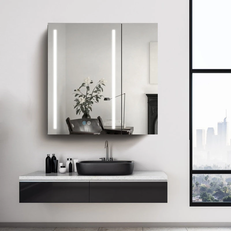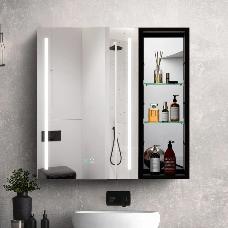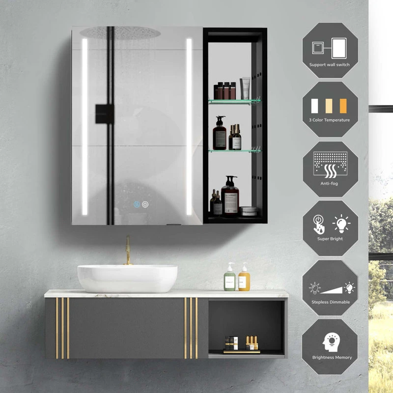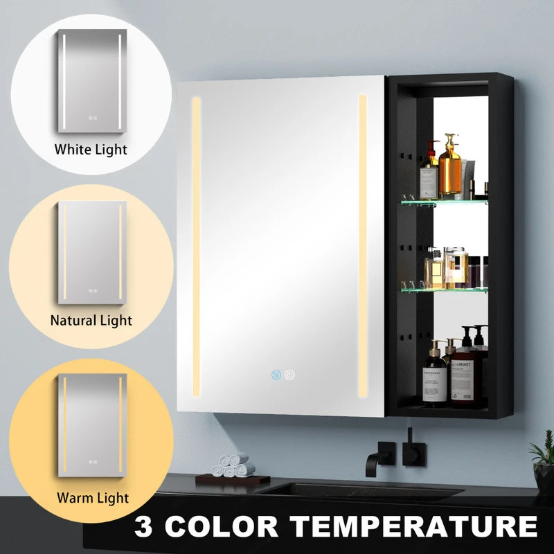 With a sleek mirrored surface inside and outside, this 30-inch multifunction medicine cabinet is a must-have for any bathroom type. This cabinet has plenty of storage space with built-in glass shelves and open shelves to hold your skincare and bathroom supplies. The dimming function allows you to better control the lighting and room atmosphere, making daily grooming more enjoyable than ever. The rust-free aluminum bathroom vanity mirror with lights is durable and moisture-proof and is the best choice for your bathroom.[Quality Materials] The mirror frame is made from aluminum alloy material, which is corrosion-resistant. You don’t have to worry about the stability of the structure.[LED Lights] 3-color temperature, dimmable led with a long press to adjust the brightness. A lighted medicine cabinet can be adjusted from 10% to 100% brightness to match your preferences.[Defogging] Our medicine cabinet’s newly developed technology enables mirror surfaces close to 40°C in a short period of time to achieve a faster and safer defogging effect. The defogging automatically turns off while the light is off.[IP44 Waterproof] IP44-rated waterproof aluminum frame medicine cabinet provides better durability and safety in your bathroom.[Ample Storage] In addition, its shelves can adjust the size of storage space to facilitate the storage of items of different sizes.