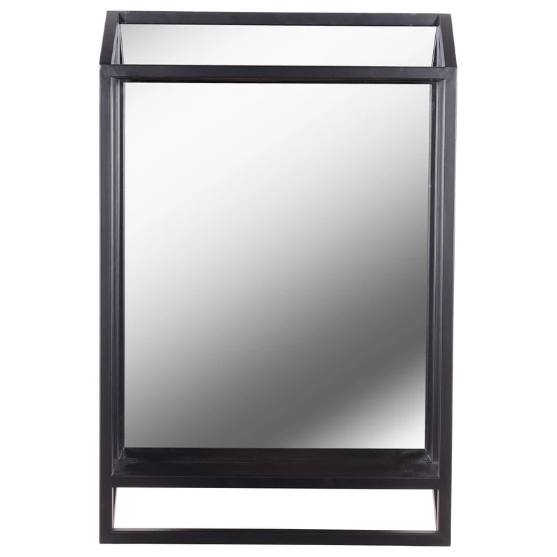Style and function all in one, this contemporary wall mirror combines the sleek, industrial look of a geometric wall mirror with the functionality of a wall shelf. This mirror features two shelves, on the top and bottom, and a towel bar allowing you to position small accents, picture frames, keys, or even cosmetic or bathroom products. Easy to hang, this matte black mirror serves as a wonderful modern accent in guest bathrooms, master bathrooms, or entryways.