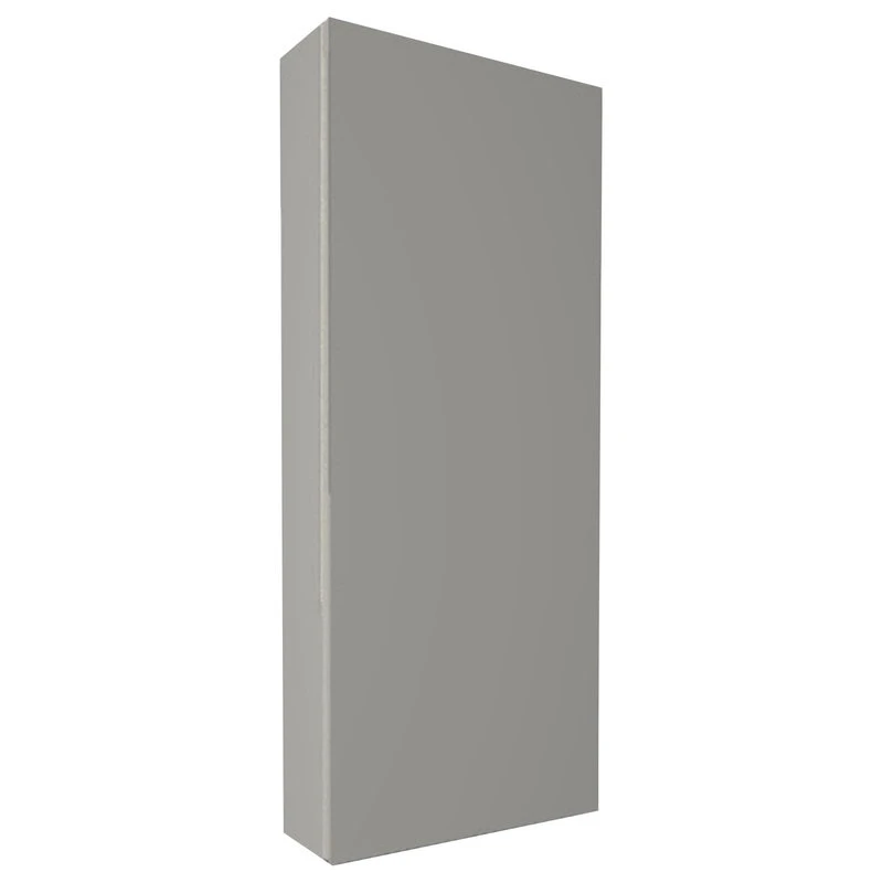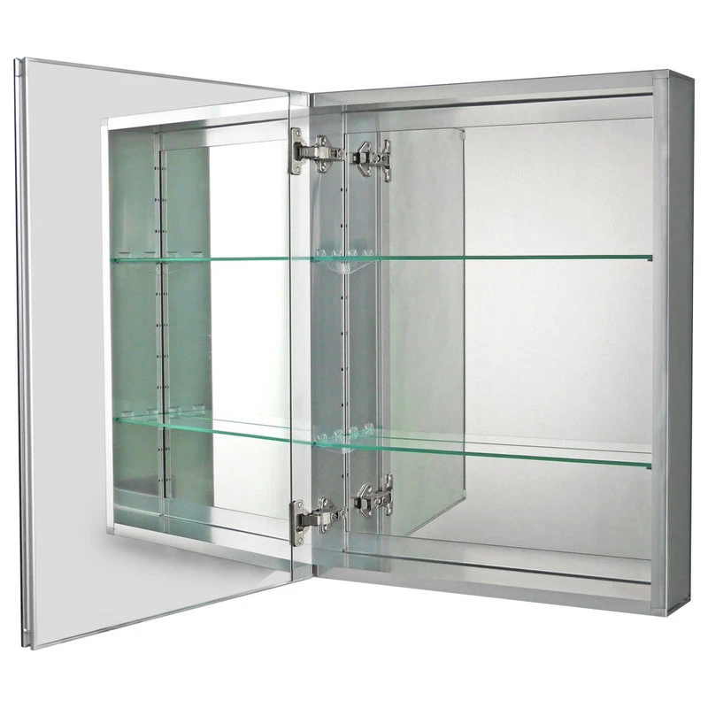 - Mirrored interior behind door and shelves for a modern look. Door features slotted finger pull on the underside. Cabinets can be inverted for right or left swing installation. Shelf Material: Tempered Glass