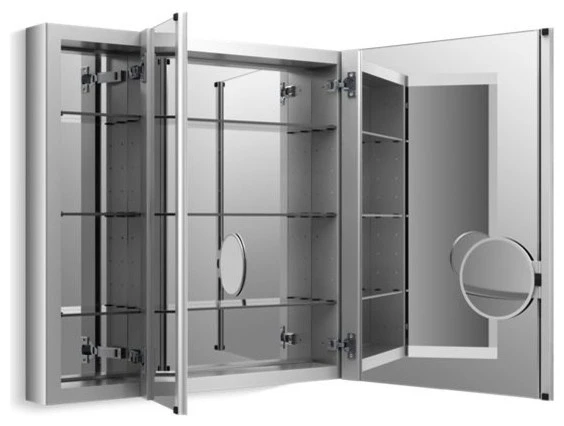 The Verdera medicine cabinet combines an elegant fit and finish with quick, easy installation. Triple mirrored doors create a light-filled gallery effect, opening to a fully mirrored interior with three adjustable glass shelves. A built-in magnifying mirror on the inside of the door is vertically adjustable to accommodate users of varying heights. Slow-close doors create a quieter bath environment.