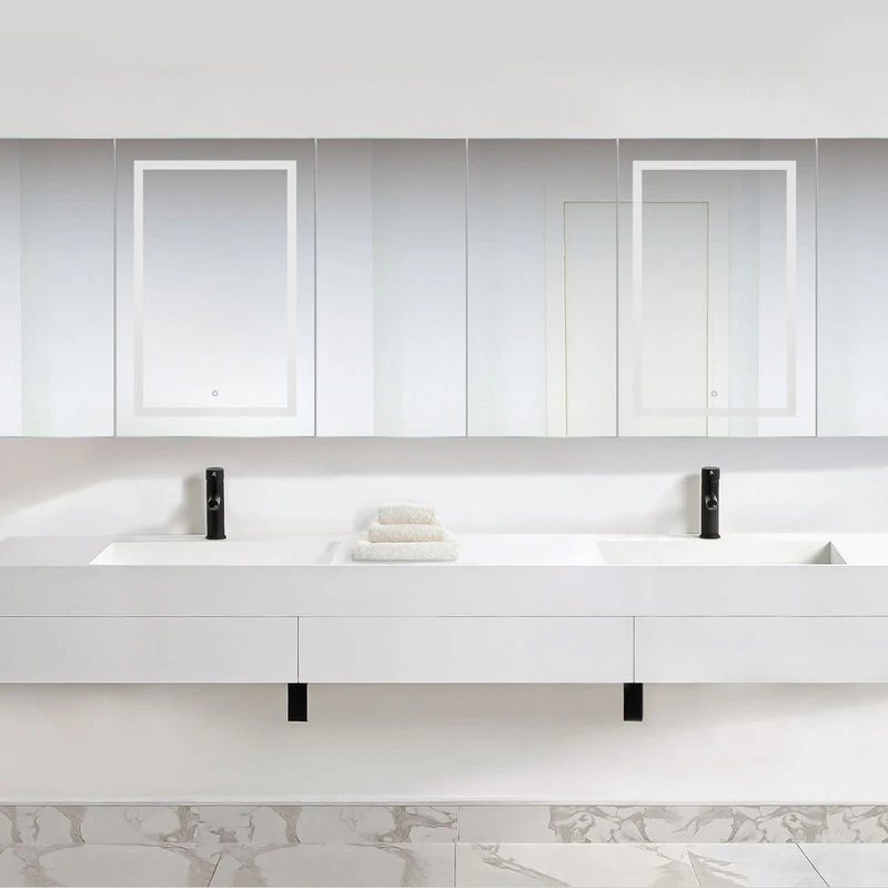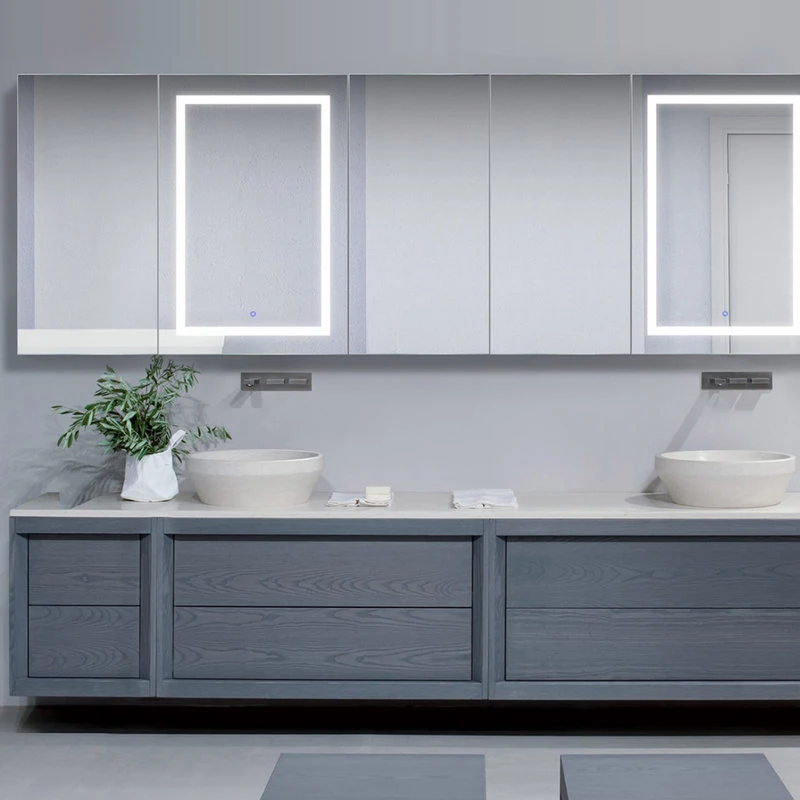 Our LED Medicine Cabinet is a symphony of design elements. We combined our most powerful lighting advancements to create a beautiful storage solution an expression of luxury and function for your bath. From a distance, the LED border produces a striking, modern glow. Up close, enjoy unparalleled light dispersion on the face and body. Effortless to use, a revolutionary touch icon is integrated into the mirror face for seamless on/off toggling and dimming with memory functionality Open the lighted section cabinet to reveal the full suite of amenities. In the mirrored door, a 3x magnified, LED-lit mirror is perfect for detailed makeup application. The mirrored interior is illuminated automatically for a luxurious touch. Our wide-angle hinges provide freedom of motion and panorama. The 2+2 smart outlet contains two traditional outlets and two USB interfaces to keep beauty tools, as well as a smartphone or tablet, close at hand. We ensure reliable optical clarity with active defogging technology. This LED Medicine Cabinet is limited only by your imagination.