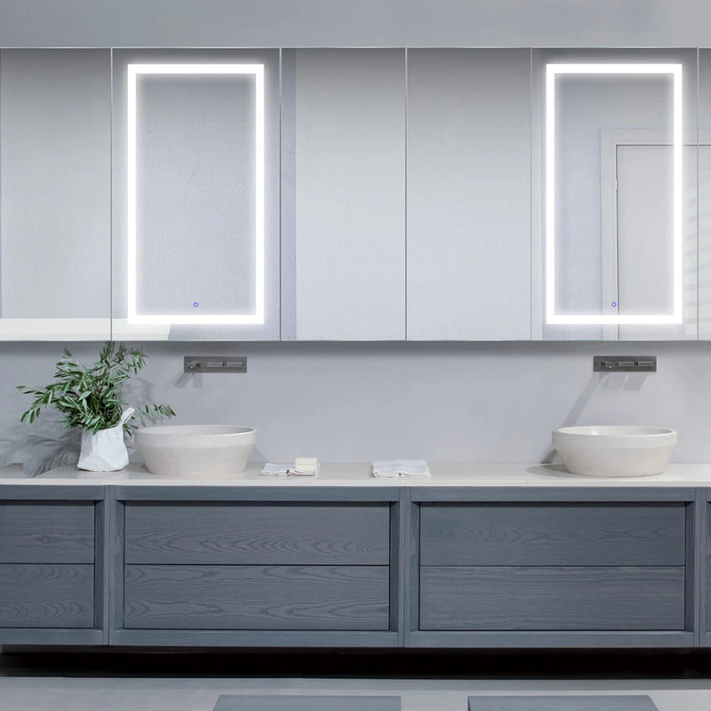 Our LED Medicine Cabinet is a symphony of design elements. We combined our most powerful lighting advancements to create a beautiful storage solution an expression of luxury and function for your bath. From a distance, the LED border produces a striking, modern glow. Up close, enjoy unparalleled light dispersion on the face and body. Effortless to use, a revolutionary touch icon is integrated into the mirror face for seamless on/off toggling and dimming with memory functionality Open the lighted section cabinet to reveal the full suite of amenities. In the mirrored door, a 3x magnified, LED-lit mirror is perfect for detailed makeup application. The mirrored interior is illuminated automatically for a luxurious touch. Our wide-angle hinges provide freedom of motion and panorama. The 2+2 smart outlet contains two traditional outlets and two USB interfaces to keep beauty tools, as well as a smartphone or tablet, close at hand. We ensure reliable optical clarity with active defogging technology. This LED Medicine Cabinet is limited only by your imagination.