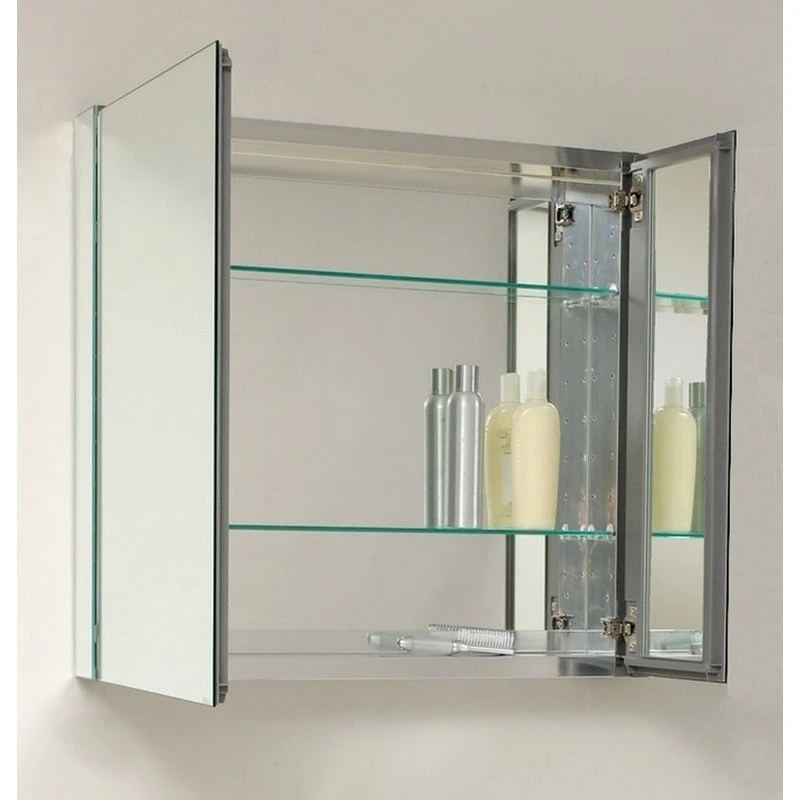 This 30″ medicine cabinet features mirrors everywhere. The edges have mirrors and also on the interior of the medicine cabinet. The inside features two tempered glass shelves. Can be surface mounted or recessed into the wall.. Integrated European Soft-Closing Hardware. 3-Way view Mirrors. Two Doors With Soft Closing Hardware. Adjustable Interior Glass Shelves. Can Be Recessed or Surface Mounted. It Matches Any Vanity. Installation Hardware
