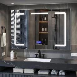 The Lesina bathroom medicine cabinet perfectly combines functionality with a unique design, providing plenty of storage room for your bathroom essentials, toiletries or accessories while adorning your space with a classy, timeless piece. The smart clock function and built-in defogger will transform your morning routine, while the Bluetooth speakers create a relaxing ambiance you’ll simply love. Everything you need within your immediate reach with the convenient shelves, low energy consumption and a superb, elegant design will make this wall mounted cabinet the perfect addition to any bathroom. This bath cabinet is available for purchase in various convenient sizes, providing a hassle-free installation and nicely complimenting any bathroom type, from contemporary, minimalist, farmhouse or boho chic. *Integrated LED light