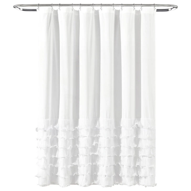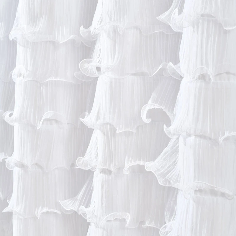 - Avery shower curtain features ripples of diaphanous tiers over soft micro fiber surface. Button holes on top allow quick installation. Measures 72×72.