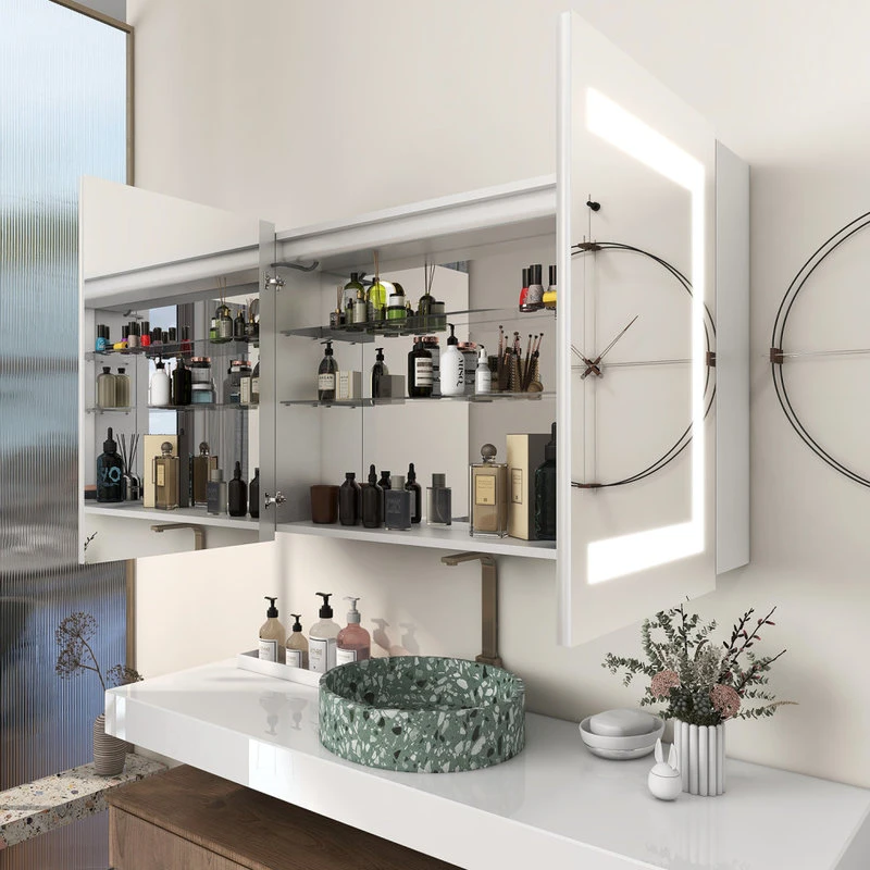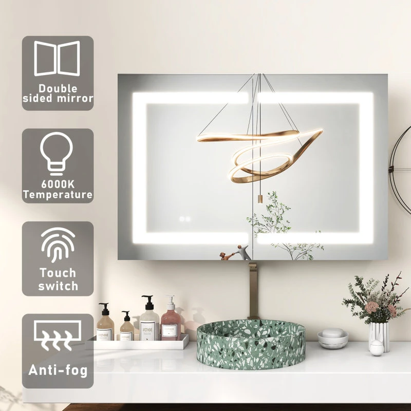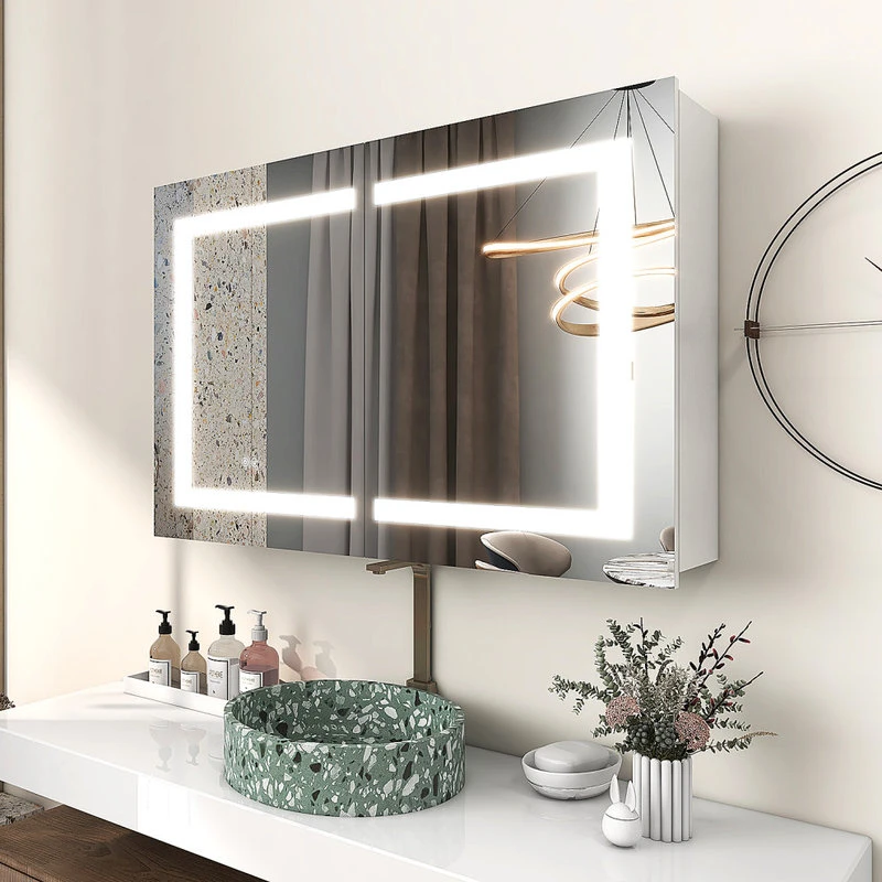 It is one of the larger of all mirrors on the market. It has ample storage capacity with three thick glass shelves that can be divided into four spaces with adjustable heights. Whether it’s a large bottle of shower gel or a small bottle of vitamins, it can be placed well.And it can be sorted and placed without wasting space.The design of the combination of half-half doors is conducive to the classification of items placed. The items behind the right cabinet doors are commonly used items, and the items behind the left cabinet doors can be placed some spare supplies or infrequently used cleaning products. Double cabinet doors are cleaner and more dustproof than semi-open mirror cabinets.Both cabinets are equipped with two touch switches, respectively, to control the main light and anti-fog function. Separate control functions can help first-time users know how to use them.