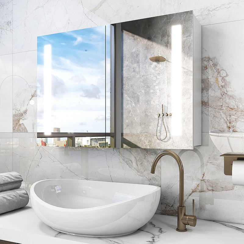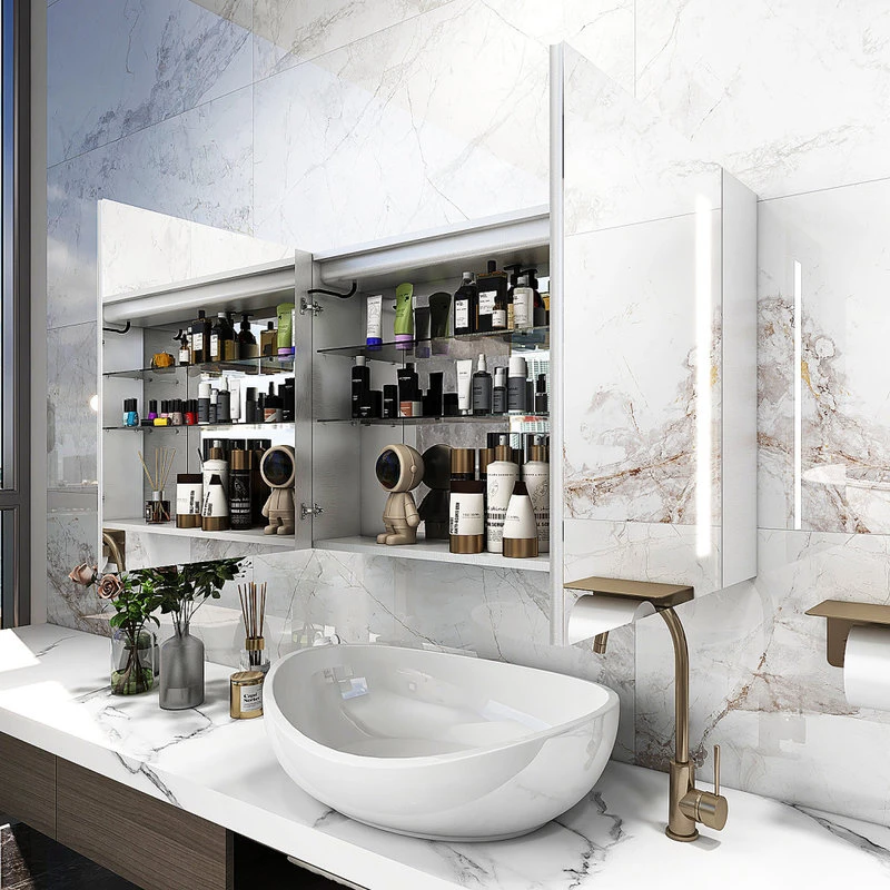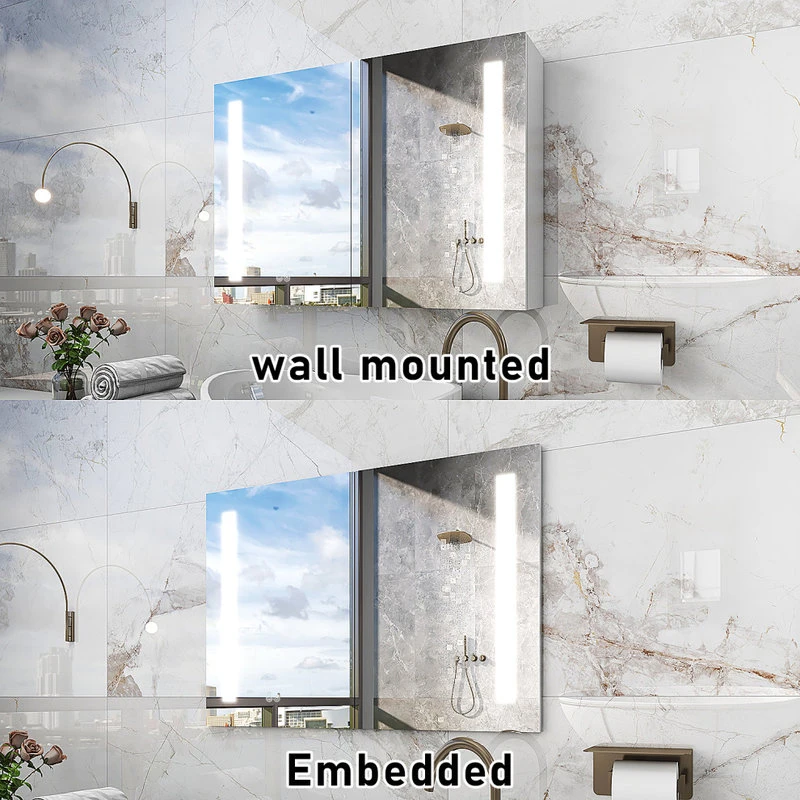 It has ample storage space with three thick glass layers, which can be separated into four spaces with adjustable heights. Whether you want to put in large bottles of shower gel or small bottles of vitamins, it is very convenient. And it can be categorized and placed without wasting space.The lighting area of this mirror cabinet is on both sides of the mirror surface.Equipped with two touch switches, one to control the main light, and one to control the anti-fog function.