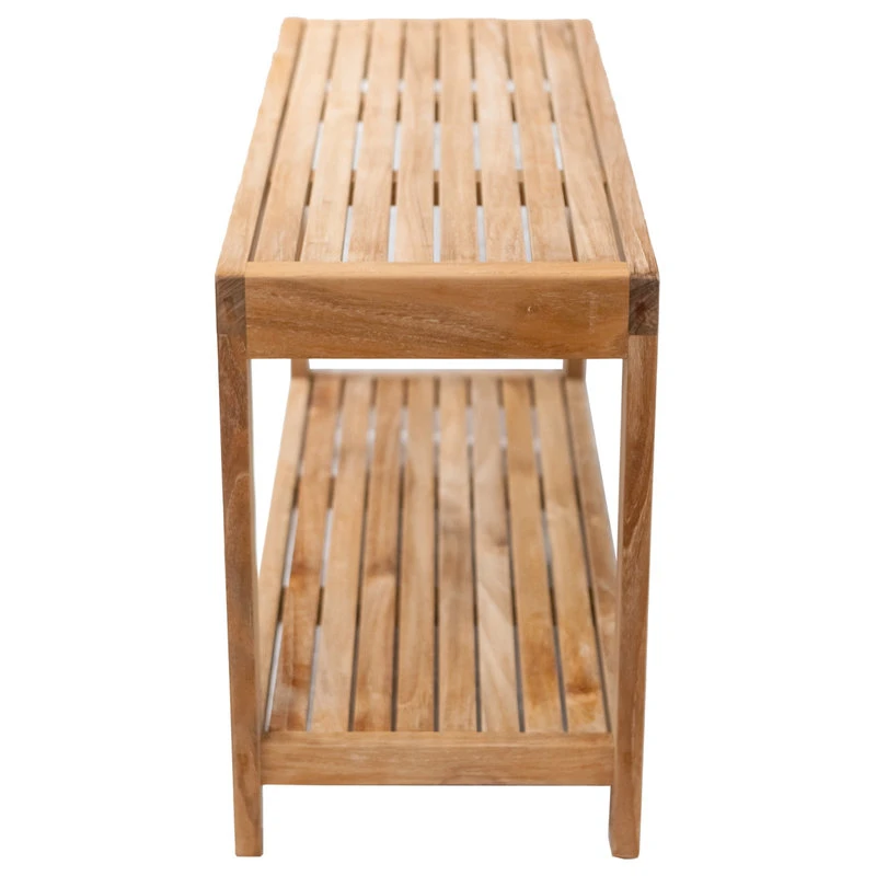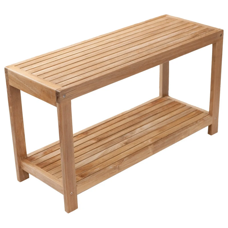 This solid teak bench is the perfect addition to your functional décor collection. Teak wood is easy to clean, sturdy, durable and comfortable. The supportive bench allows you to comfortably sit and take a moment of rest, lay your towels, shampoos, grooming supplies and just about everything in between (weight capacity is roughly 250lbs). If you happen to run out of space up top, utilize the lower storage shelf.