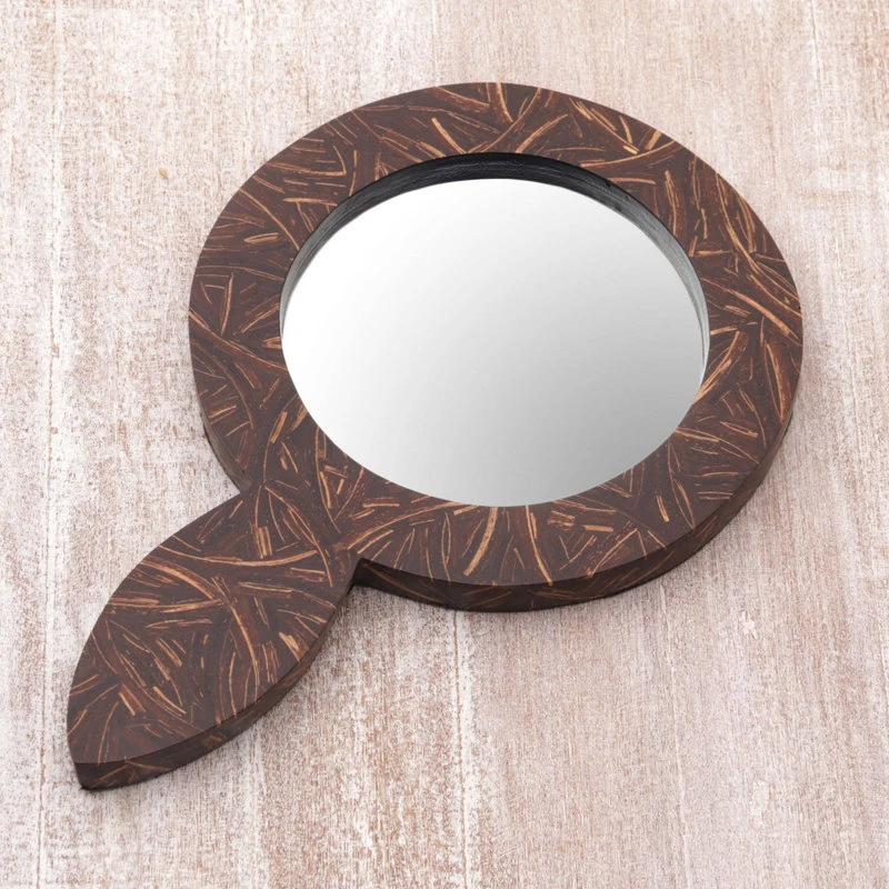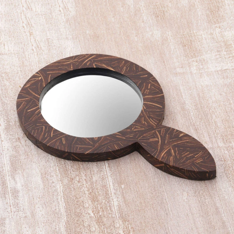 Indonesian artisan Dewi Hady employs the natural beauty of the coconut shell to create this unique hand mirror. Supported by an MDF base, the mirror features strips of coconut shell that create the design.