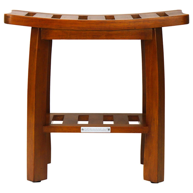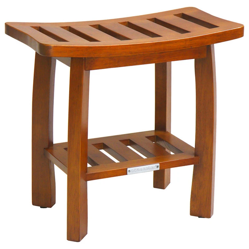Create the perfect bed and bath setting with the Oceanstar Solid Wood Spa Bench with Storage Shelf. The spa bench offers extra seating and storage space in the bathroom. Both the top seat and bottom shelf is ideal for storing various bath products such as bottles and toiletry. While the top seat can be used as storage, it can also be used for seating. The slatted and bowed design of the seat allows for better air circulation and water flow. Each leg features nonslip levelers for stability. No assembly is required so there is no time wasted in using the spa bench. With the modern and compact style of the spa bench, it is suited for any home environment whether it is in the shower stall, bathroom, or the bedroom.