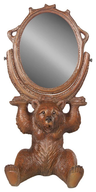 This lovely Sitting Bear Mirror is a rustic style brushed wood magnificent sitting bear with swivel mirror for all tabletop surfaces. It measures 10 inches wide, 8 inches deep, and 20 inches high, and is made of resin. This gorgeous piece is perfect for a home with a rustic or even transitional style decor!