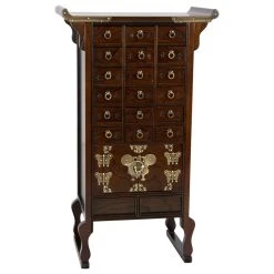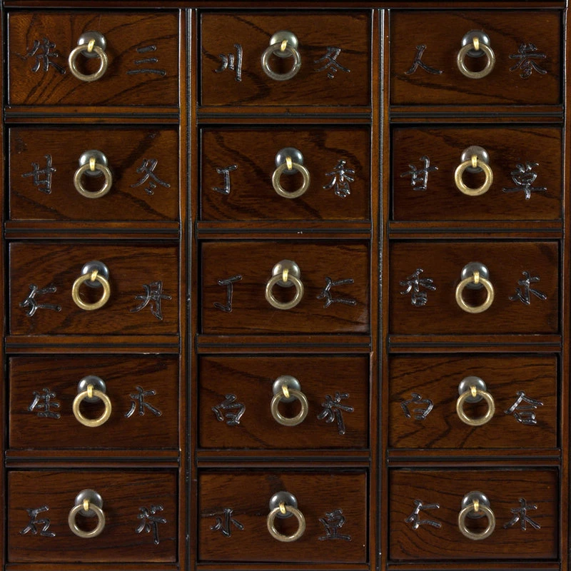 Exceptional quality hand crafted oriental style apothecary cabinet with 18 small drawers originally used for storing Chinese herbal medicine and acupuncture. A distinctive Asian decorative accent in authentic Korean / Japanese antique design, compliments both traditional and contemporary American interiors.