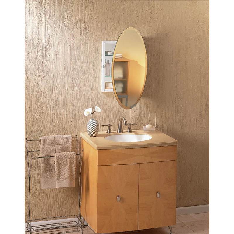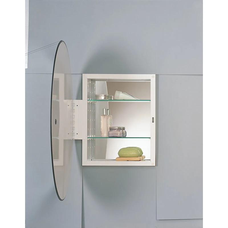 - Frameless mirror door- 3/16in thick float glass oval mirror front with 1in beveled edge, 23 gauge steel door back with white, heat cured, acrylic paint finish