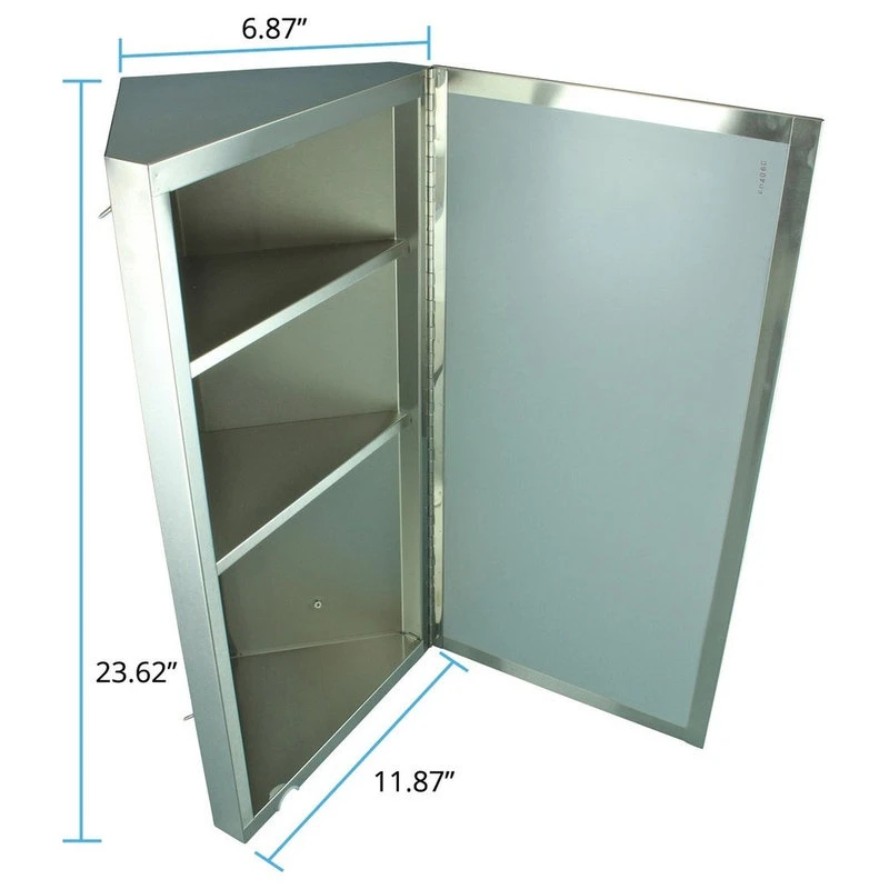 This elegant corner medicine cabinet door opens up to three interior shelves. It is manufactured out of 100% superior stainless steel material. It can be mounted on any corner wall – Opens from LEFT to RIGHT!