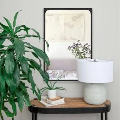 - A black powder coated finish adds a hint of industrial chic to the decorative mirror’s farmhouse influences