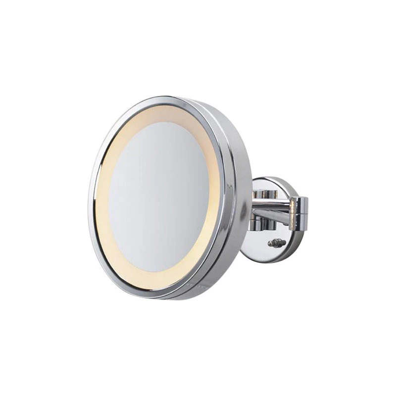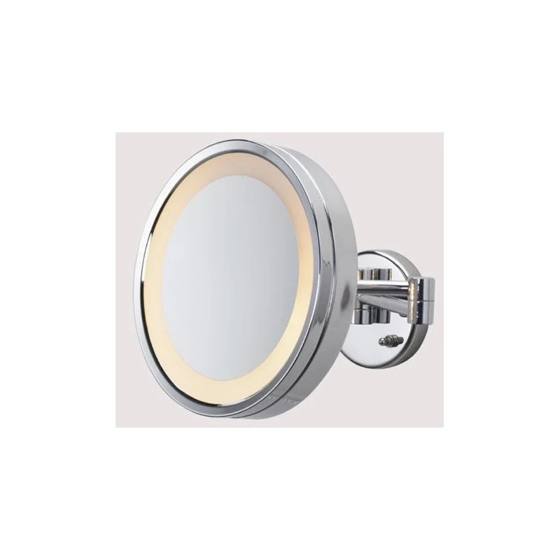 Specifications: Lighted nine 3/4 inch Diameter Wall Mounted Chrome Make-up Mirror five times Magnification (single sided)