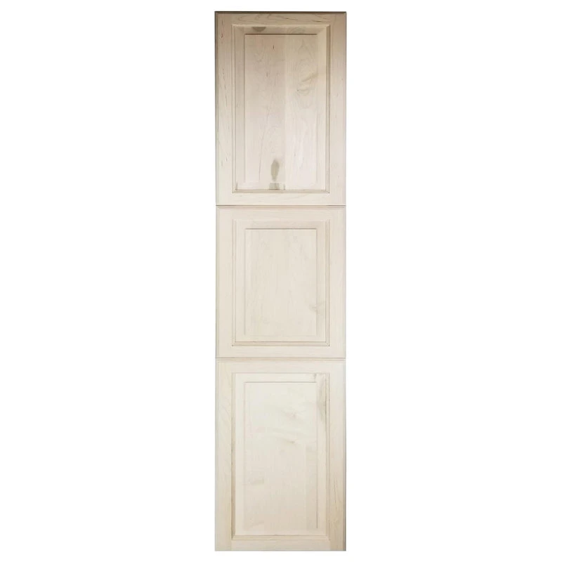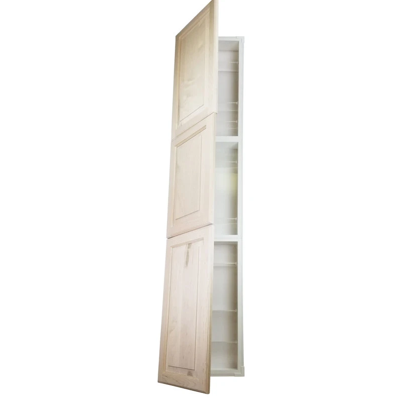Perfect for any bathroom. Recesses in the wall between the studs, and simply screws to the studs on each side of the opening. Only the doors are outside the wall. Fully adjustable glass shelves inside. Our unique, patented design of shelf supports keeps each shelf in place. Concealed hinges with soft close built in assures the door will never slam shut, but softly close on its own instead. Box is SOLID pine and the Raised panel style door is SOLID maple. We’ve painted the inside of the box white, so you don’t have to! Unfinished doors can be painted or stained. The box is 3.5″ deep inside and gives you plenty of usable depth, but fits in standard 2×4 walls. This model has THREE doors which open to reveal two separate cabinet sections. Cabinet box is 12.5″ wide inside. Doors are reversible to open either Left or Right. Completely assembled! All you need to do is put one screw in each hinge to mount the door. Then insert it in the wall and screw it to the studs with included screws. If you are replacing a current cabinet, measure your wall opening! White plastic trim surround covers the rough edges of your opening up to 1/2″ all around. Doors cover the trim surround when closed so the only thing you see outside the wall is the door itself. Made in USA.