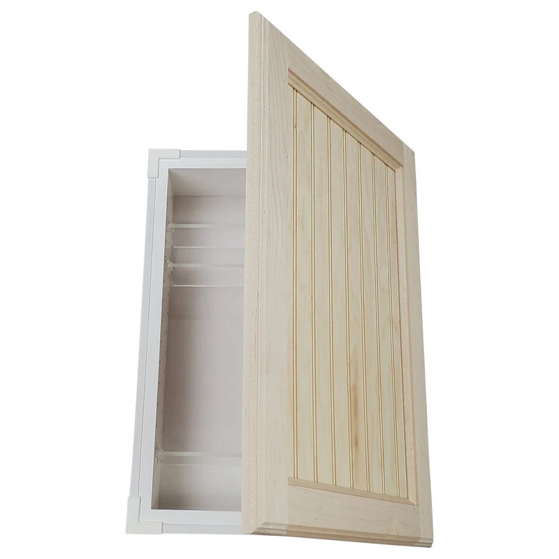 Perfect for any bathroom. Recesses in the wall between the studs, and simply screws to the studs on each side of the opening. Only the door is outside the wall. Fully adjustable glass shelves inside. Our unique, patented design of shelf supports keeps each shelf in place. Concealed hinges with soft close built in assures the door will never slam shut, but softly close on its own instead. Box is SOLID pine and the Beadboard panel style door is SOLID maple. We’ve painted the inside of the box white, so you don’t have to! Unfinished door can be painted or stained. The box is 3.5″ deep inside and gives you plenty of usable depth, but fits in standard 2×4 walls. Cabinet box is 12.5″ wide inside. Door is reversible to open either Left or Right. Completely assembled! All you need to do is put one screw in each hinge to mount the door. Then insert it in the wall and screw it to the studs with included screws. If you are replacing a current cabinet, measure your wall opening! White plastic trim surround covers the rough edges of your opening up to 1/2″ all around. Door covers the trim surround when closed so the only thing you see outside the wall is the door itself. Made in Sarasota, FL.