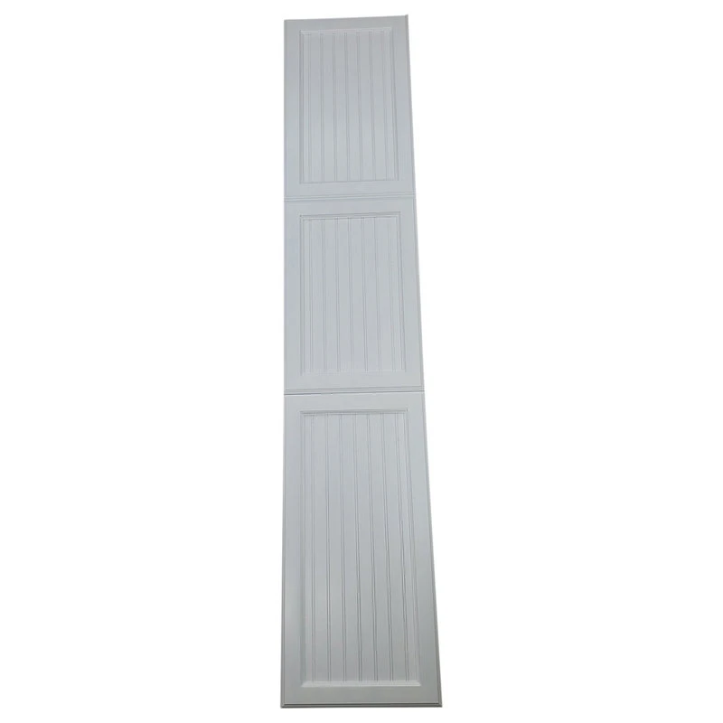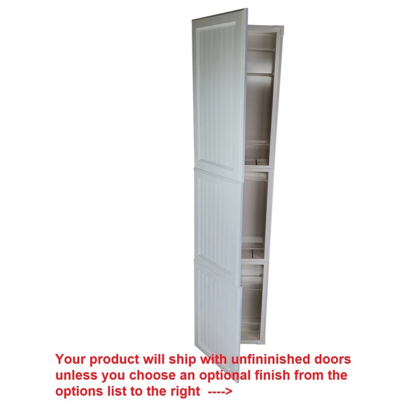 Perfect for any bathroom. Recesses in the wall between the studs, and simply screws to the studs on each side of the opening. Only the doors are outside the wall. Fully adjustable glass shelves inside. Our unique, patented design of shelf supports keeps each shelf in place. Concealed hinges with soft close built in assures the door will never slam shut, but softly close on its own instead. Box is SOLID pine and the Beadboard panel style door is SOLID maple. White enamel finish. The box is 3.5″ deep inside and gives you plenty of usable depth, but fits in standard 2×4 walls. This model has THREE doors which open to reveal two separate cabinet sections. Cabinet box is 12.5″ wide inside. Doors are reversible to open either Left or Right. Completely assembled! All you need to do is put one screw in each hinge to mount the door. Then insert it in the wall and screw it to the studs with included screws. If you are replacing a current cabinet, measure your wall opening! White plastic trim surround covers the rough edges of your opening up to 1/2″ all around. Doors cover the trim surround when closed so the only thing you see outside the wall is the door itself. Made in USA.