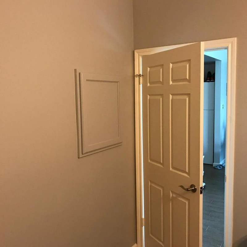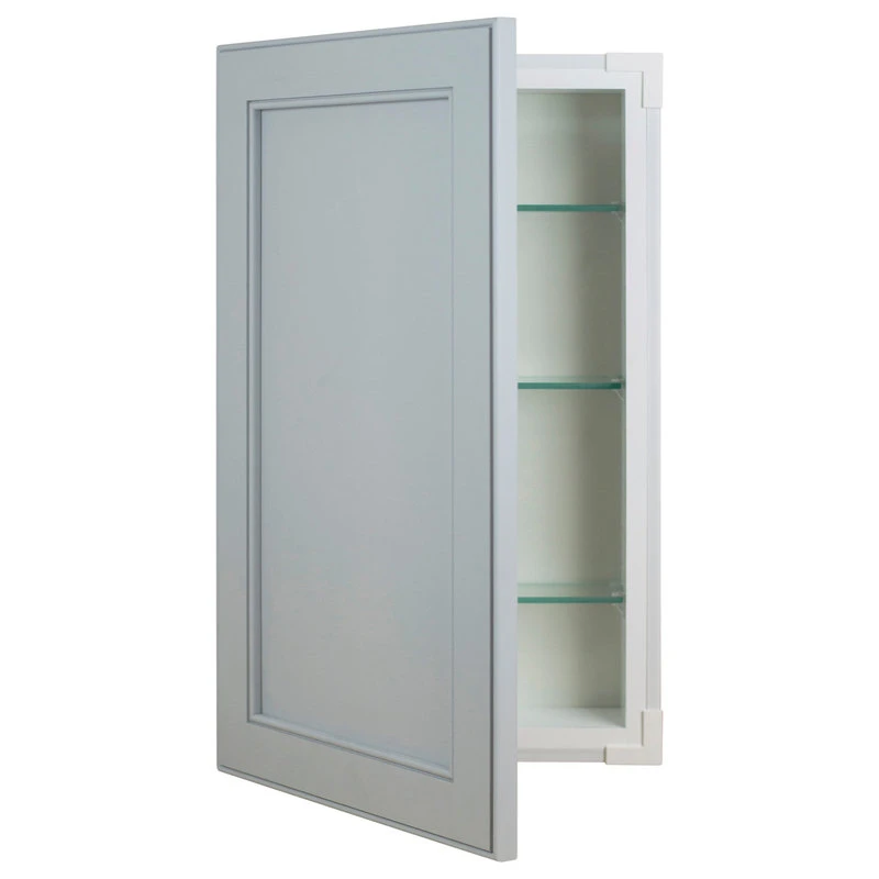 Perfect for any bathroom. Recesses in the wall between the studs, and simply screws to the studs on each side of the opening. Only the door is outside the wall. Fully adjustable glass shelves inside. Our unique, patented design of shelf supports keeps each shelf in place. Concealed hinges with soft close built in assures the door will never slam shut, but softly close on its own instead. Box is SOLID pine and the Double Villa Bead panel style door is SOLID maple. We’ve painted the inside of the box white, so you don’t have to! Primed door is ready for you to paint it. The box is 3.5″ deep inside and gives you plenty of usable depth, but fits in standard 2×4 walls. Cabinet box is 12.5″ wide inside. Door is reversible to open either Left or Right. Completely assembled! All you need to do is put one screw in each hinge to mount the door. Then insert it in the wall and screw it to the studs with included screws. If you are replacing a current cabinet, measure your wall opening! White plastic trim surround covers the rough edges of your opening up to 1/2″ all around. Door covers the trim surround when closed so the only thing you see outside the wall is the door itself. White plastic trim surround covers the rough edges of your opening up to 1/2″ all around. Door covers the trim surround when closed so the only thing you see outside the wall is the door itself. Made in Sarasota, FL.
