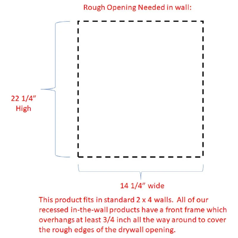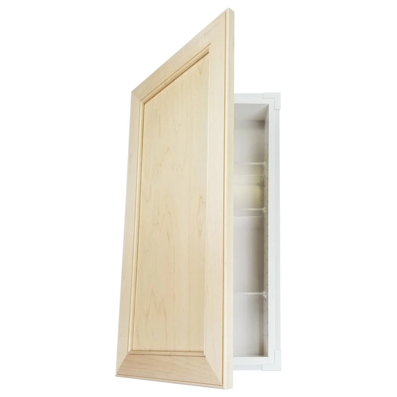 Perfect for any bathroom. Recesses in the wall between the studs, and simply screws to the studs on each side of the opening. Only the door is outside the wall. Fully adjustable glass shelves inside. Our unique, patented design of shelf supports keeps each shelf in place. Concealed hinges with soft close built in assures the door will never slam shut, but softly close on its own instead. Box is SOLID pine and the Double Villa Bead panel style door is SOLID maple. We’ve painted the inside of the box white, so you don’t have to! Unfinished door can be painted or stained. The box is 3.5″ deep inside and gives you plenty of usable depth, but fits in standard 2×4 walls. Cabinet box is 12.5″ wide inside. Door is reversible to open either Left or Right. Completely assembled! All you need to do is put one screw in each hinge to mount the door. Then insert it in the wall and screw it to the studs with included screws. If you are replacing a current cabinet, measure your wall opening! White plastic trim surround covers the rough edges of your opening up to 1/2″ all around. Door covers the trim surround when closed so the only thing you see outside the wall is the door itself. Made in Sarasota, FL.