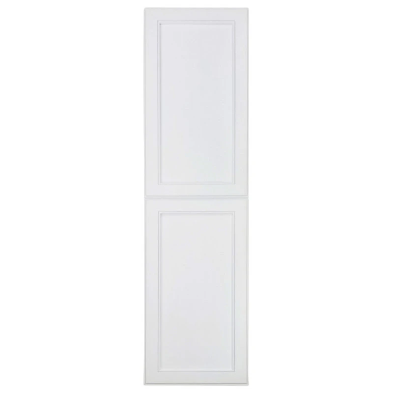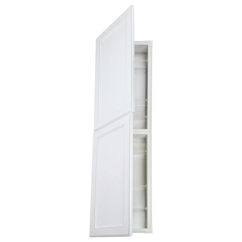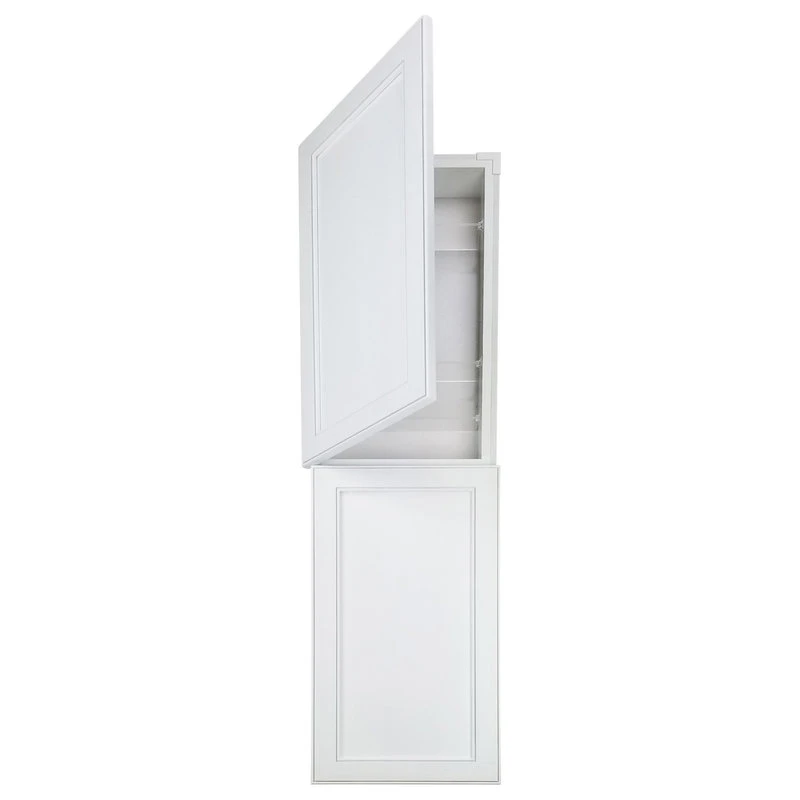Perfect for any bathroom. Recesses in the wall between the studs, and simply screws to the studs on each side of the opening. Only the doors are outside the wall. Fully adjustable glass shelves inside. Our unique, patented design of shelf supports keeps each shelf in place. Concealed hinges with soft close built in assures the door will never slam shut, but softly close on its own instead. Box is SOLID pine and the Villa Bead Panel style door is SOLID maple. White enamel finish. The box is 3.5″ deep inside and gives you plenty of usable depth, but fits in standard 2×4 walls. This model has TWO doors which open to reveal two separate cabinet sections. Cabinet box is 12.5″ wide inside. Doors are reversible to open either Left or Right. Completely assembled! All you need to do is put one screw in each hinge to mount the door. Then insert it in the wall and screw it to the studs with included screws. If you are replacing a current cabinet, measure your wall opening! White plastic trim surround covers the rough edges of your opening up to 1/2″ all around. Doors cover the trim surround when closed so the only thing you see outside the wall are the doors. Made in USA.