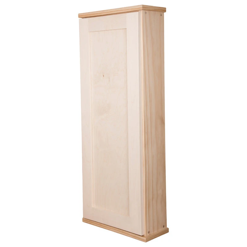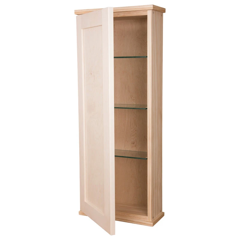 Mounts on the wall with steel mounting brackets inside for an easy installation. With two mounting methods, there is no need to worry about where the studs are in the wall. Five fully adjustable glass shelves slide into our patented shelf supports so they don’t tip or rock. Shaker style panel door sits on concealed hinges with soft close feature, door is reversible so you can mount it to open either direction. Perfect as a medicine cabinet, spice cabinet, or storage cabinet anywhere. OVERALL Measurements are 49.5h x 15.25w x 3.25″d OVERALL. You’ll have nearly 2.5″ of depth INSIDE the cabinet. Unfinished bare wood can be painted or stained as desired. Solid pine cabinet box with solid maple door. Proudly made in the USA.