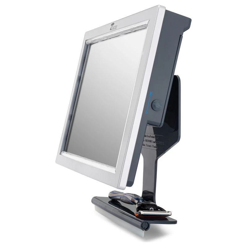 A large Fogless Shower Mirror illuminated by LED lights. This patented shaving mirror is guaranteed not to fog in the shower