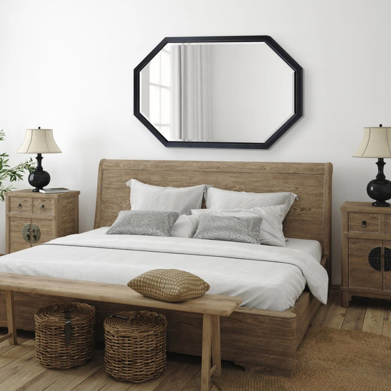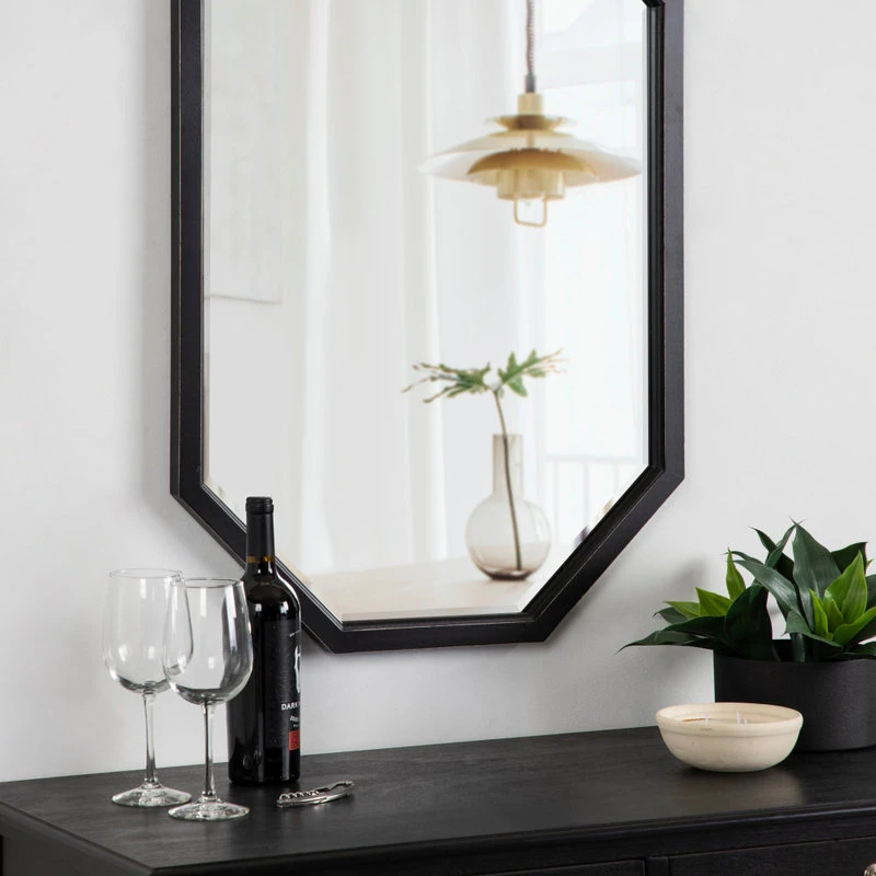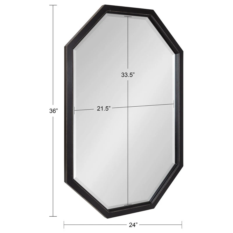 The Hogan mirror is the perfect addition to your farmhouse-inspired home. This mirror puts a modern twist on the farmhouse aesthetic, featuring an octagonal shape that draws the eye and adds a chic dimension to your wall. The frame of the Hogan is made from solid wood and features a rustic black finish reminiscent of vintage decor pieces. This frame gives the Hogan a resilient quality that lasts for multiple years of display. Its overall dimensions are 24 inches wide by 1 inch deep by 36 inches tall, making it a commanding presence for any room. If you’re renovating your bathroom, the Hogan is fantastic as a bathroom mirror above a single or double vanity. Adding a mirror as a decorative focal point in your home increases the vibrancy of your space while making it appear brighter and dimensional. Hang the Hogan in your entryway, bedroom, dining room, or living room for a fun and unique statement display. This mirror is easy to mount on your wall regardless of where you hang it with the metal D-ring hangers, allowing you to hang it in multiple orientations.