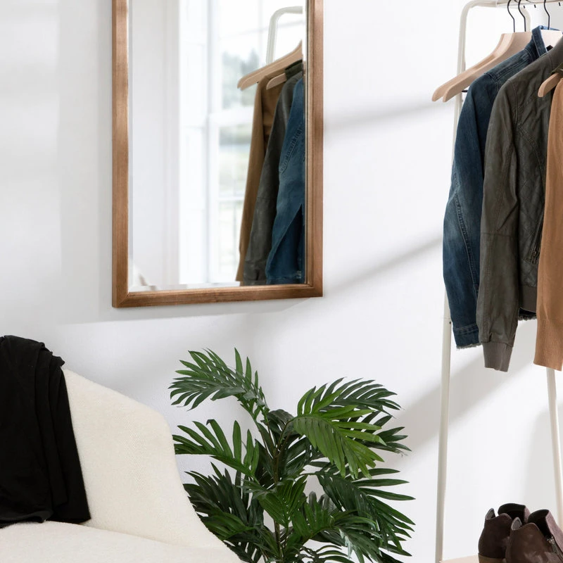 The stylish and rustic-inspired Hogan mirror gives your home an accent piece with a cozy quality. The Hogan wall mirror puts a modern twist on farmhouse decor pieces, featuring a minimal rectangular shape and a rustic brown finish. It is a simple way to add a vibrant accent piece to your wall that is low-maintenance yet visually striking. The Hogan’s frame has a beautiful and rich solid wood construction, giving it a robust look and premium quality. The overall dimensions of this farmhouse mirror are 20 inches by 1 inch by 30 inches, making it a fantastic accent piece for various spaces. This mirror hangs vertically and horizontally to create a wall display that matches the vibe and style of your decor space. Adding a visual focal point like the Hogan wall mirror to your home enhances the light in your home, making it feel more dimensional and overall more open. Hang this beautiful wall mirror in a matter of minutes with the D-ring hangers that are attached to the back of the frame.