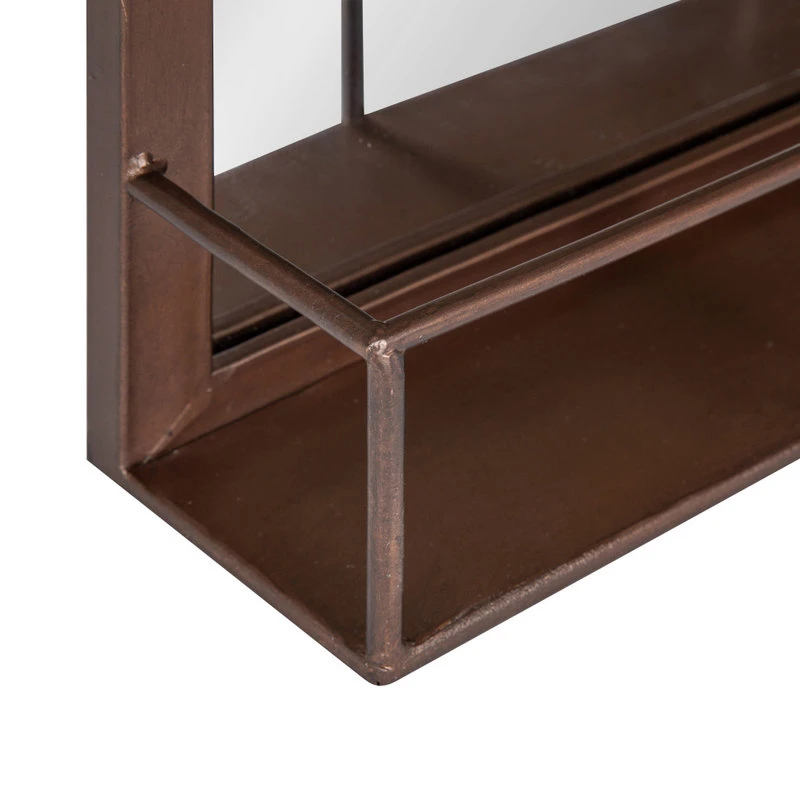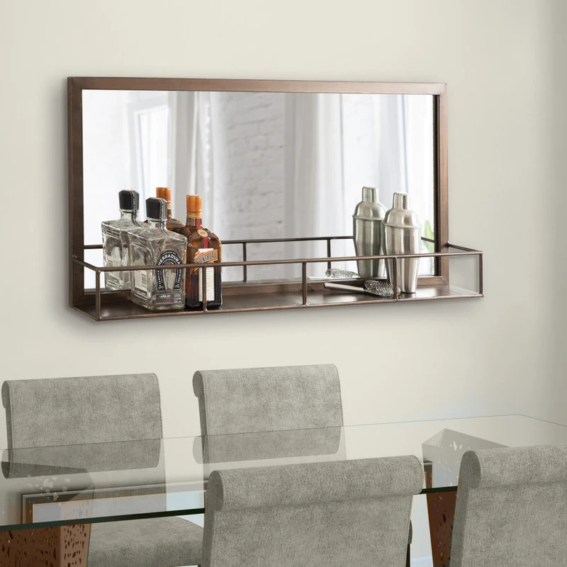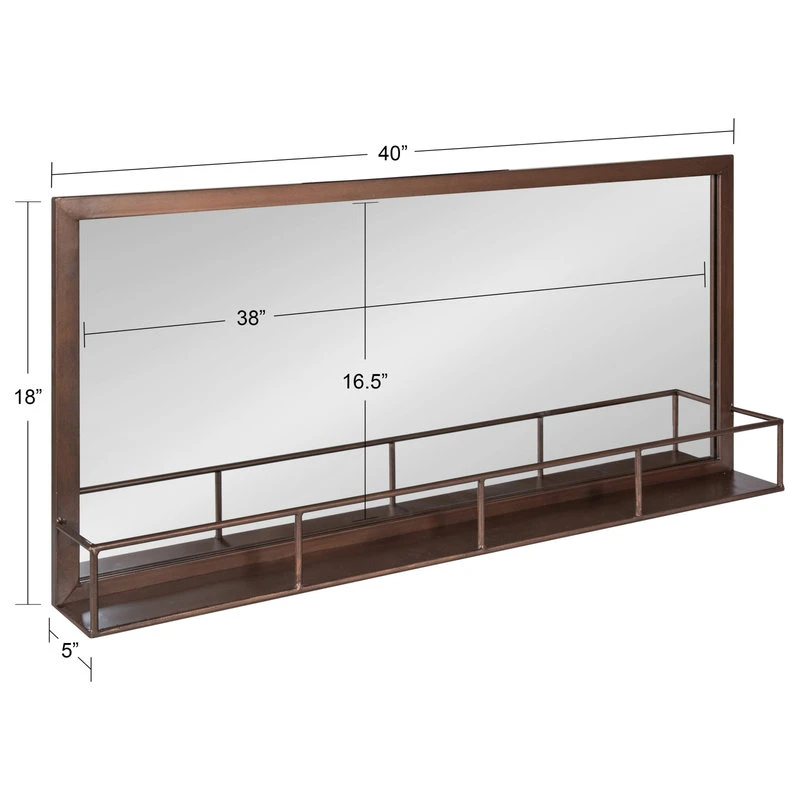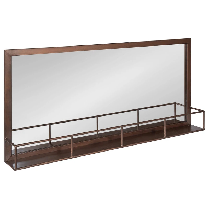 This beautiful metal mirror offers your home a robust accent that delivers unique functionality. The Jackson mirror has a modern design, featuring a sleek, iron frame coated in a sophisticated bronze finish. Its both industrial and practical, featuring a slim frame surrounding a small storage ledge. The Jackson is perfect for showcasing your distinct style while adding a sense of dimension to your space. Its overall dimensions are 40 inches wide by 5 inches deep by 18 inches tall, creating an oversized and visually striking accent that commands attention in your home. The shelf ledge attached is 4 inches deep and runs along the width of the mirror. It’s fantastic for showcasing decorative accents like succulents or photos, plus it’s excellent for storing things like toiletries, jewelry, and other household necessities. Its large size is perfect for adding light and dimension above your bed, over a console table, or on your vanity. Hang the Jackson wall mirror in a matter of minutes with the resilient keyhole hangers attached to the back of the frame.