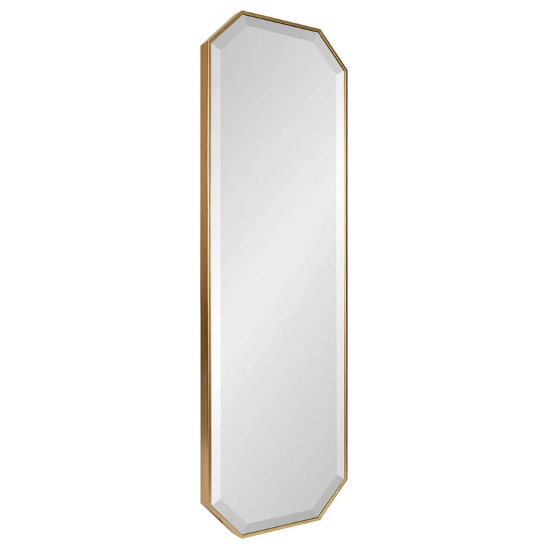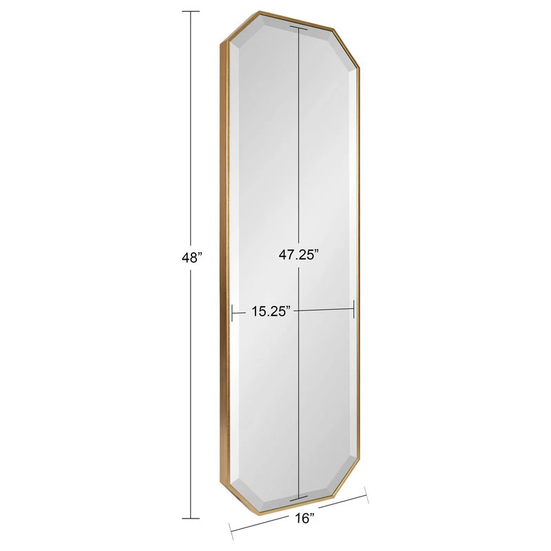 Indulge in the glamorous, minimal aesthetic of the Rhodes wall mirror, a practical wall accent for any room. Inspired by modern, geometric forms, the Rhodes mirror has minimal lines and a lovely octagon shape. The Rhodes surface is constructed with a resilient plastic frame and mirrored glass while offering a beveled edge to spread more light throughout the area. Adding a mirror to your wall expands your space by reflecting light, creating a more dimensional, open concept room. Hang this practical, geometric accent in any modern or glamorous living room, bedroom, entryway, bathroom, closet, or dining room. The overall dimensions of this mirror are 16.75 inches wide by 1.5 inches deep by 48.75 inches tall, showcasing a robust, full-length mirror for checking your appearance, tying your tie, or doing your makeup. Showcase the Rhodes on its own for a bold focal point or in multiples to create a grand wall display. The metal D-ring hangers attached to the back of the frame allow you to hang it both vertically or horizontally, depending on your unique decorative aesthetic.
