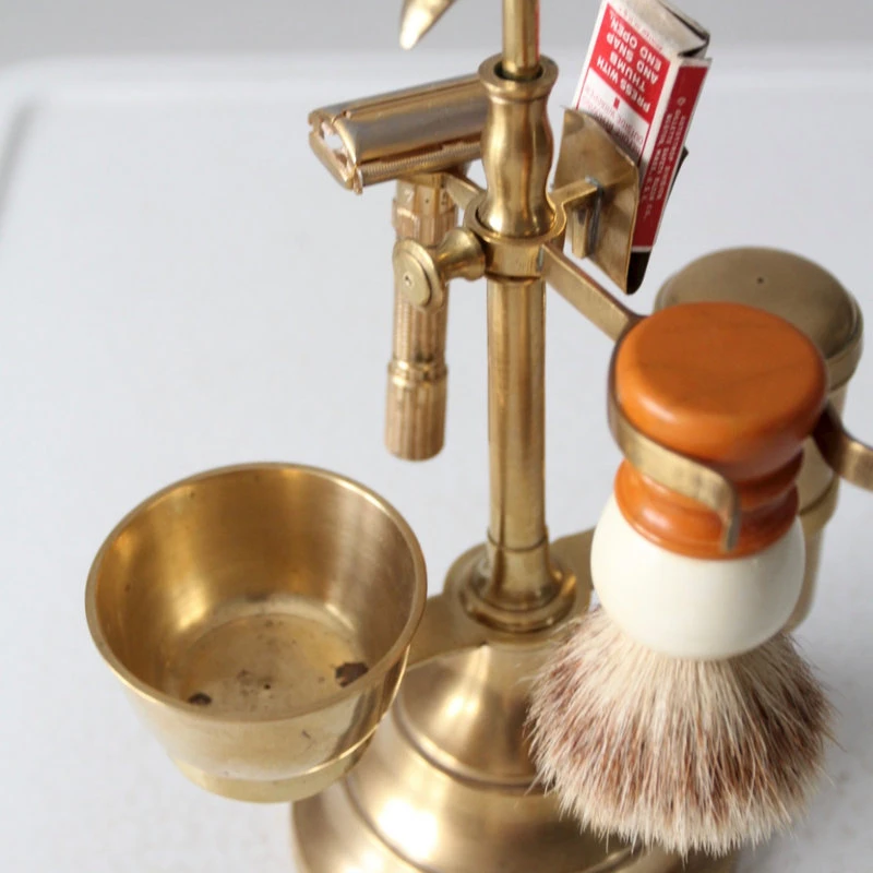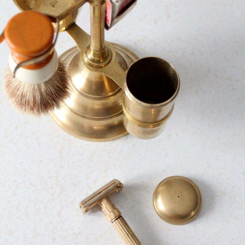 This is an antique brass grooming stand and accessories. A dual sided mirror features holds for a razor, blades, and brush with a brush bowl and tin for storing lather on its stand. A gold tone Gillette safety razor is included (circa 1950) with Valet Auto Strop blades, and a bakelite handle brush.