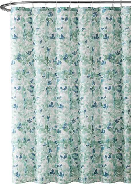 VCNY Lush Nature Bathroom Shower Curtain, Teal Green White Leaf Pattern On Faux Linen