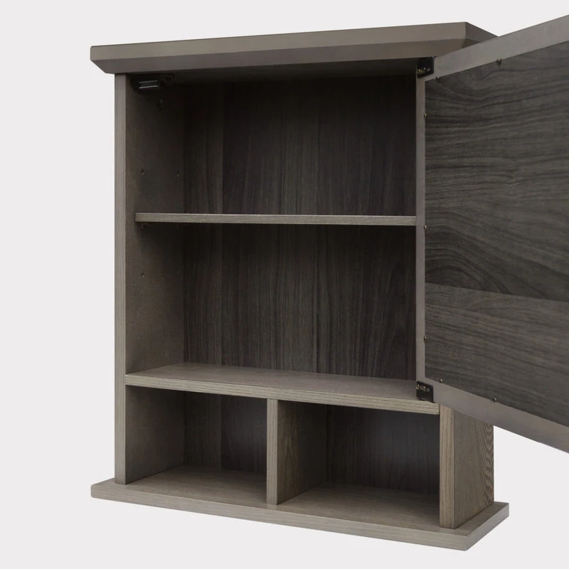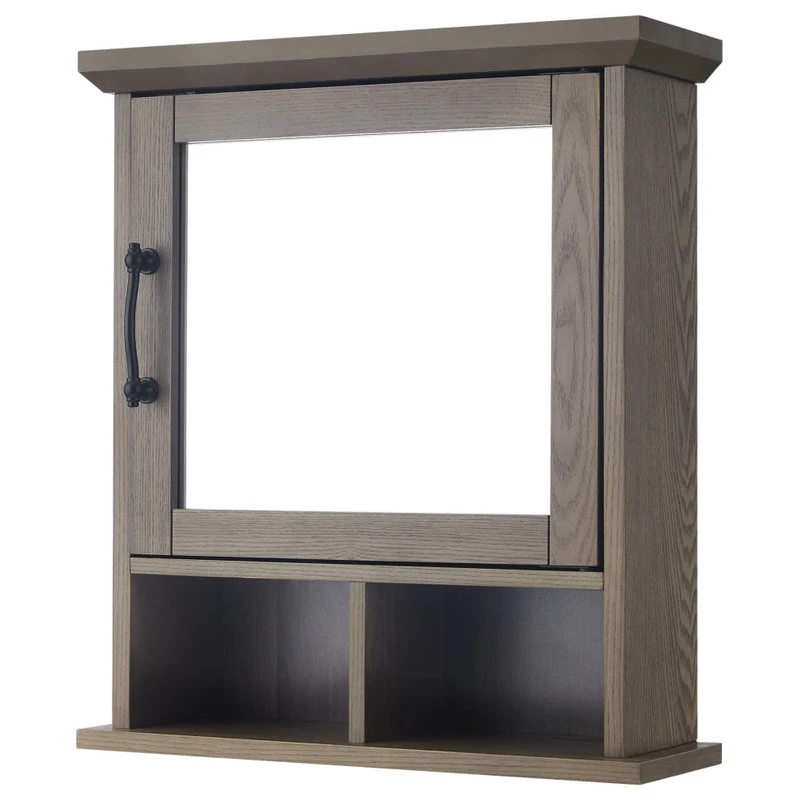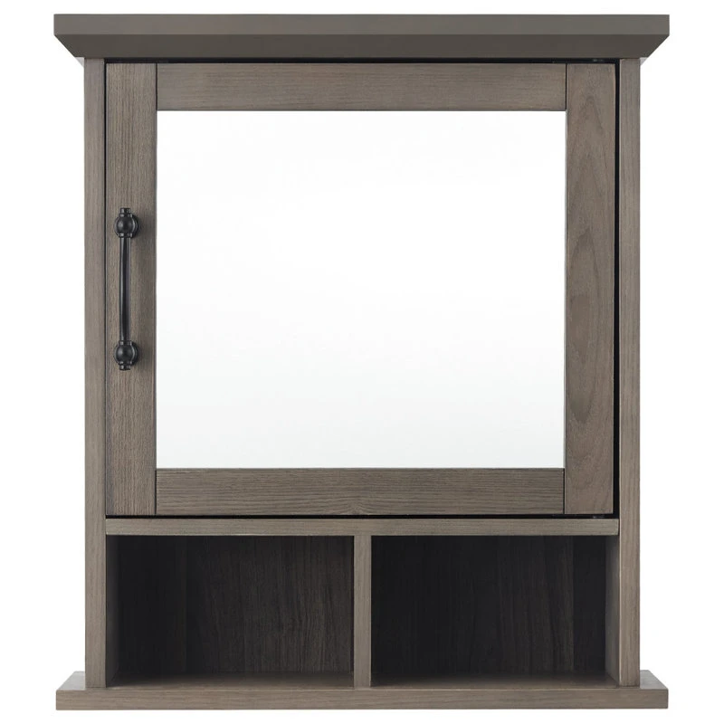 Upgrade your bathroom storage while adding modern farmhouse decor with the Elegant Home Fashions Russell Modern Farmhouse Wooden Medicine Cabinet. This decorative cabinet features a rustic salt oak finish with mirrored door and matte black pull for an elevated and stylish addition to your space. The interior adjustable shelf and two bottom open shelves offer customizable and functional storage that is great for storing toothbrushes, toothpaste, soaps, lotions, and more to reduce clutter and keep your bathroom tidy. Constructed from durable engineered wood, this medicine cabinet is built to provide you with long-lasting organization. Easy, step-by-step instructions and all of the hardware needed are included for quick assembly. Purchase this stylish cabinet alone or with other items from the Russell collection for a cohesive, updated look. The Elegant Home Fashions Elegant Home Fashions Russell Wooden Medicine Cabinet with Mirror and Open Shelving measures 6″ x 18″ x 20.6″ to provide removable storage without taking up too much space in your bathroom.