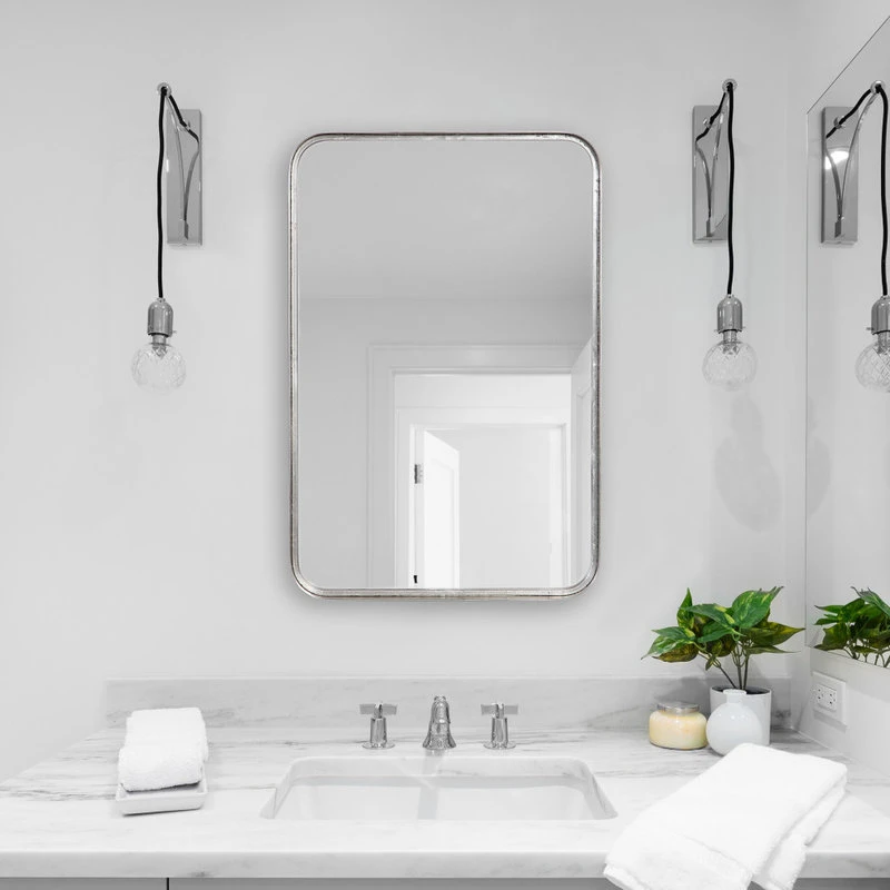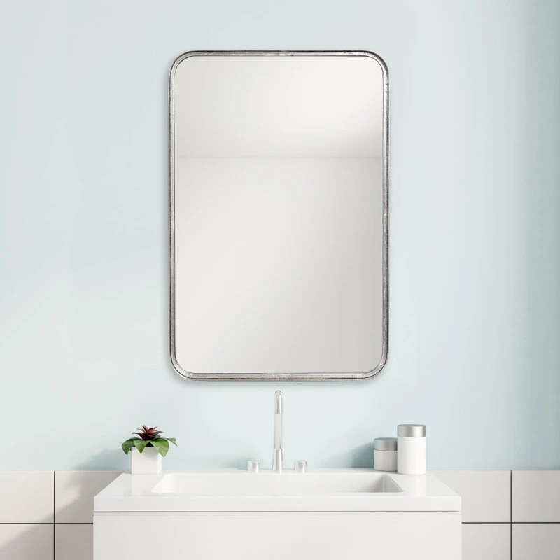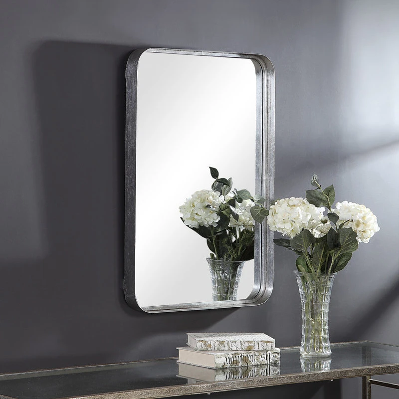 This frame, with its rounded corners and inner ledge, is made of a thick metal strap and finished in a burnished silver leaf. May be hung either vertically or horizontally.