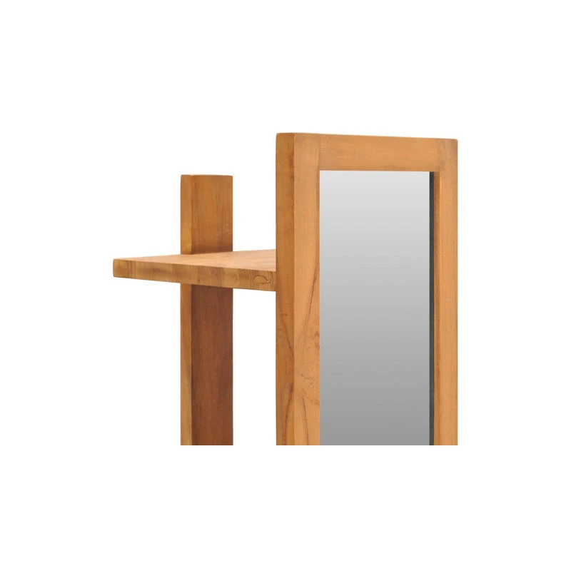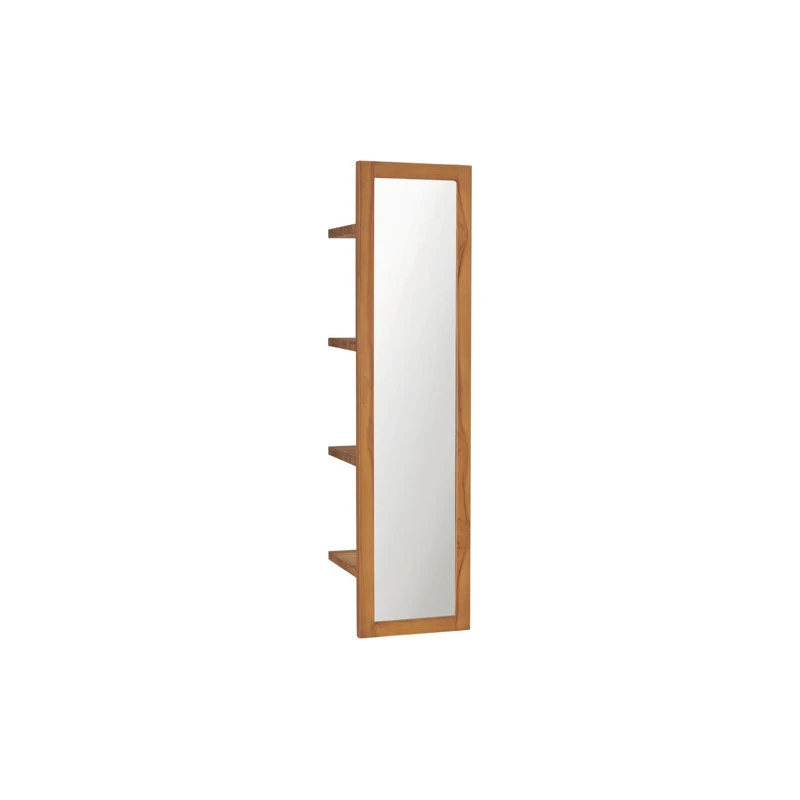 This wall mirror with shelves, featuring a colonial yet rustic style, provides double functions in your bathroom decor. The bathroom mirror is made of solid teak wood with a natural finish, making it quite stable and easy to maintain. This wooden mirror has four open shelves at the backside, so it not only can be used to look yourself in the mirror but also offers sufficient space to place shampoos, cosmetics, toothpastes, etc. Additionally, for your convenience, there are mounting holes inserted in this product when it is put on the wall.