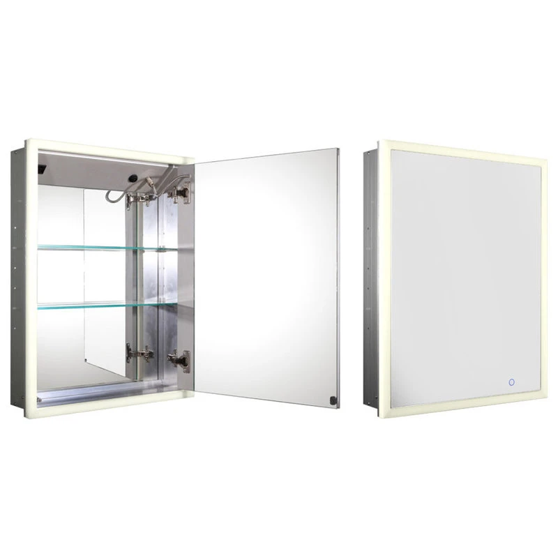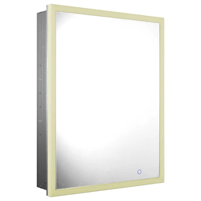 WHLUN7055-IR Medicinehaus recessed single door anodized aluminum cabinet with an electric outlet, defogger, and blue-lit LED power button and dimmer for light around the front.