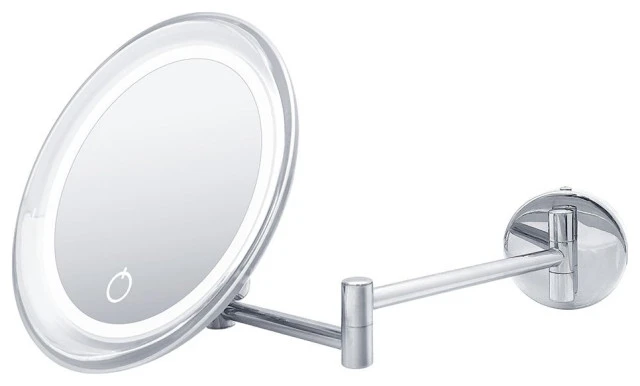 Beauty 300T, Hard-Wired, LED Lighted, Magnifying Makeup Mirror, by WS Bath Collections. The Beauty 300T has a continuous LED Light Range that changes from a cool white (daylight white) to a warm white, operated using a simple touch sensor. The mirror has True-Look Glass that gives you a reflection with no distortions. Modern design, made of solid brass, and finished in polished chrome.