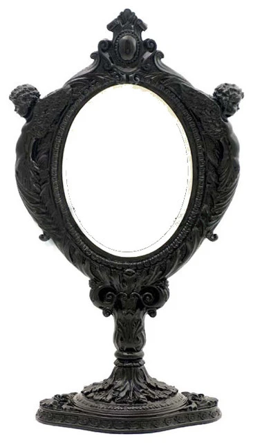 Set up your dresser by placing this magnificent yet adorable Black Baroque Two Cherubs Mirror from XoticBrands. This decorative and stylish mirror is designed by the professional artists in a traditional design. It is crafted of high-quality polystone and embellished with a black hue to amend a royal touch. The base and mirror are delicately embossed with a flowing leaf design, and the adornment of two cherubs on the mirror edges creates a splash of elegance. It comes with a round, stable base that allows it to sit and flat and lend a sportier look. All in all, it will make a great addition to your mirror frame collection.Category: Mirror Made of PolystoneMeasures 8.46(L) x 4.72(W) x 14.96(H) Inches,Weighs 5.4lbs